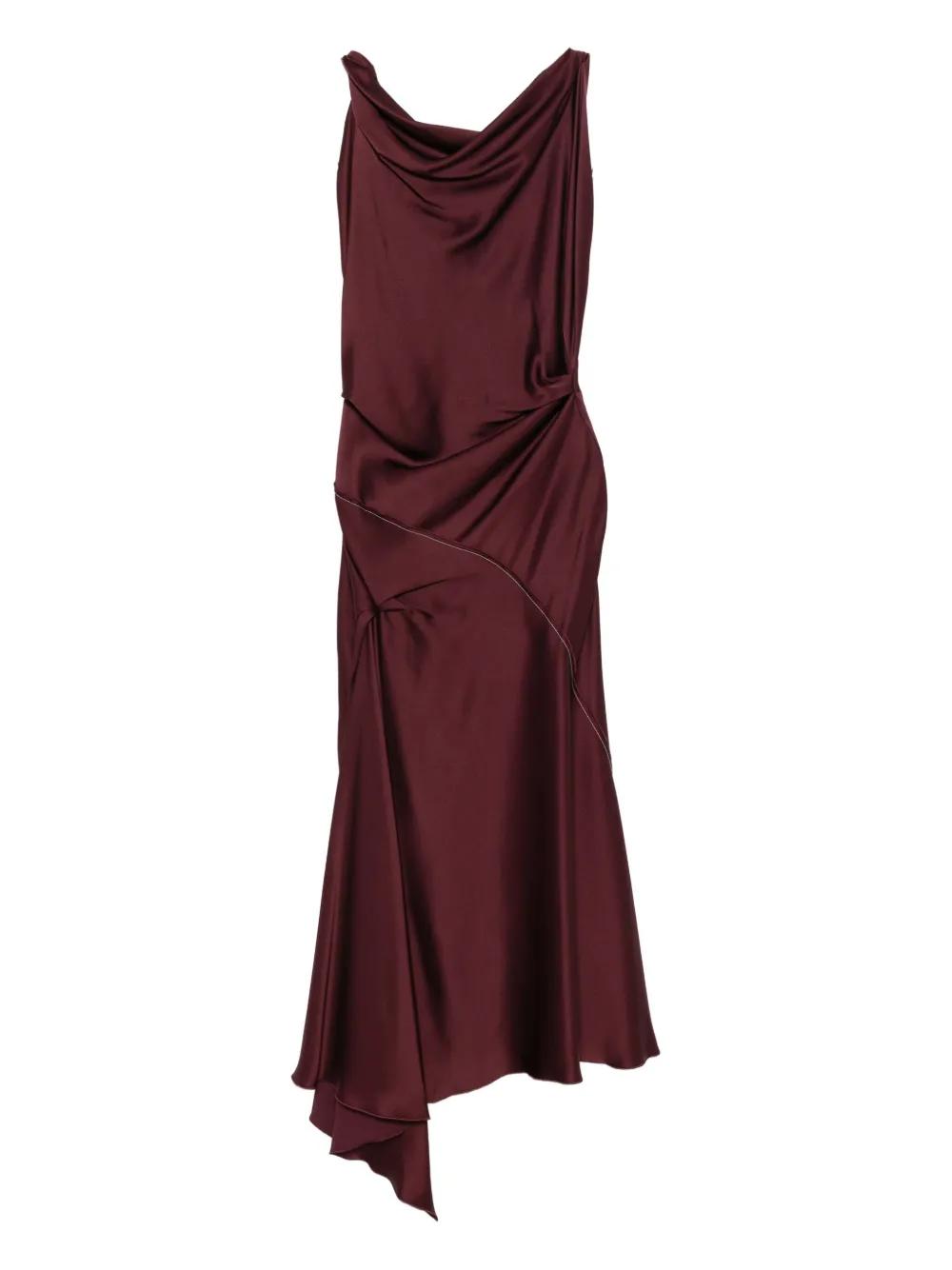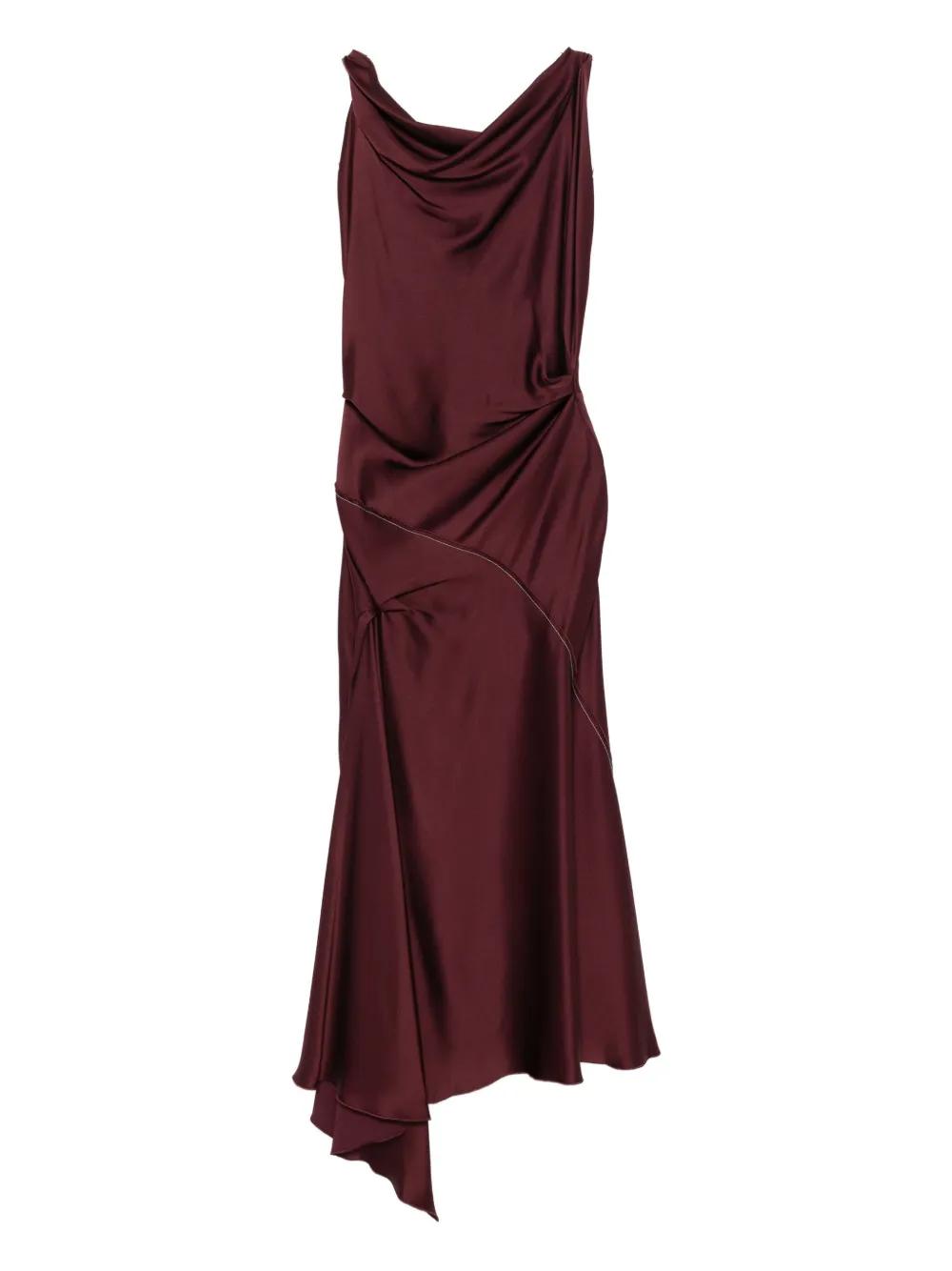 cinnabar red cowl neck asymmetric hem draped detail sleeveless tonal stitching