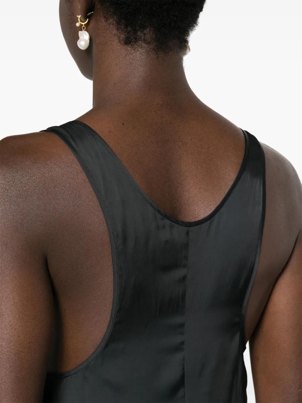 black satin weave scoop neck racerback slip-on style sleeveless front slit flared long length