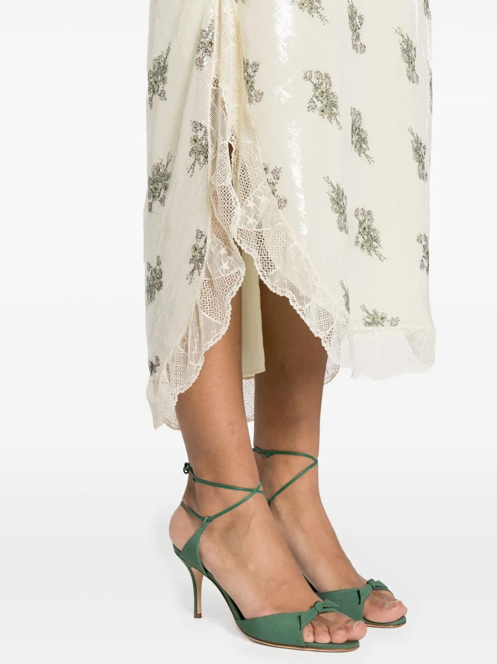 light yellow/multicolour stretch-design all-over floral print sequin embellishment lace trim V-neck spaghetti straps short side slits flared hem long length full lining