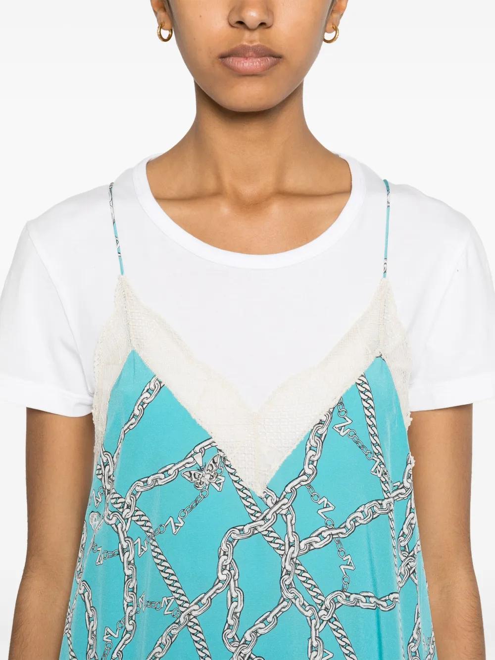 aqua blue silk crepe texture all-over chain and ZV signature print A-line lace trim to the neckline and hem spaghetti straps sleeveless V-neck side slits ankle-length curved hem unlined pull-on style