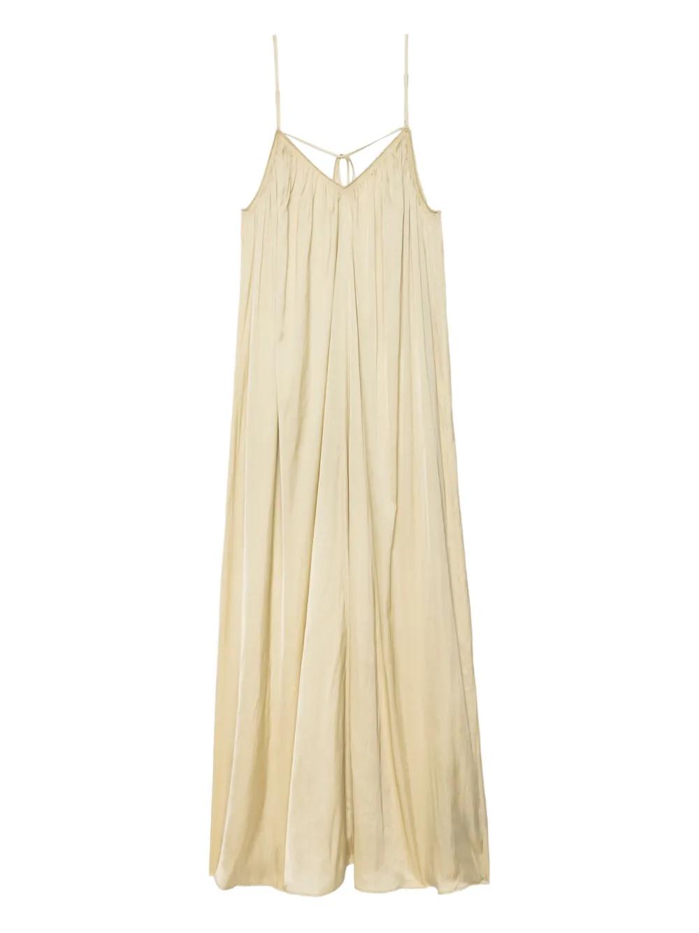 pale beige spaghetti straps gathered neckline back tie fastening floor-length