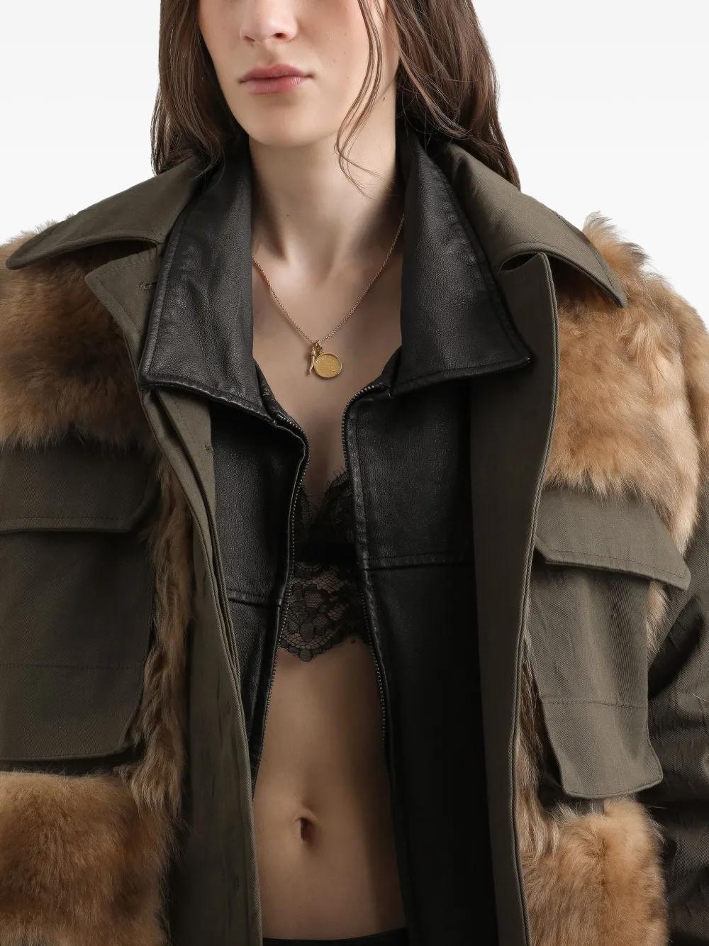 olive brown faux fur panels multiple pockets belted waist front button fastening
