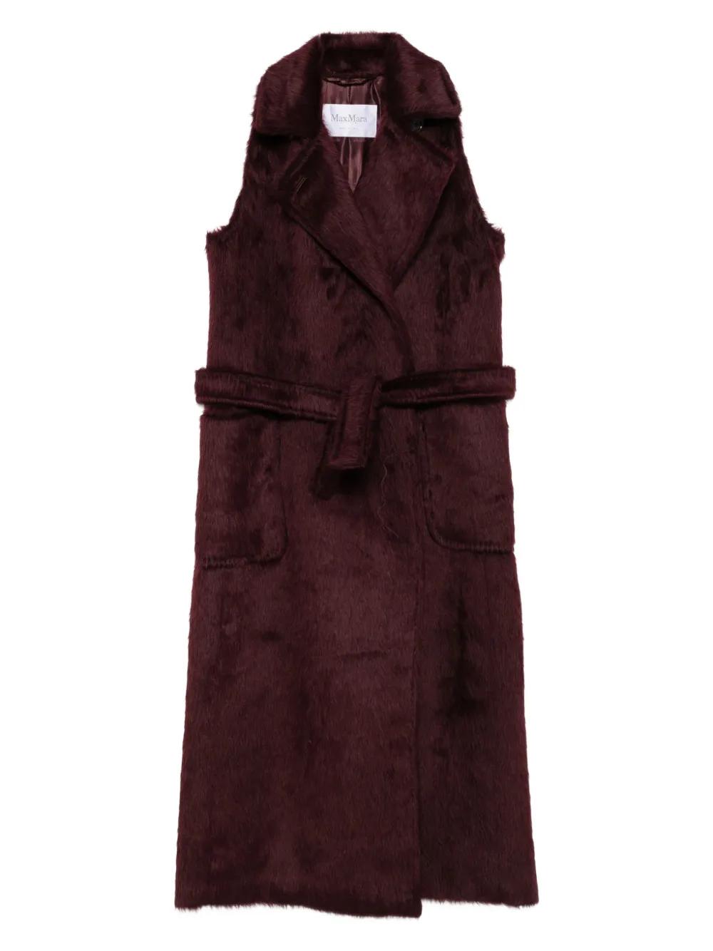 dark red sleeveless design self-tie belt notched lapels two side patch pockets straight hemline