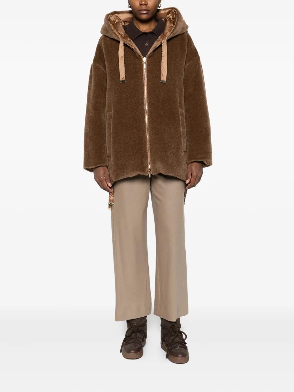 camel brown drawstring hood zip fastening front patch pockets ribbon detail short length