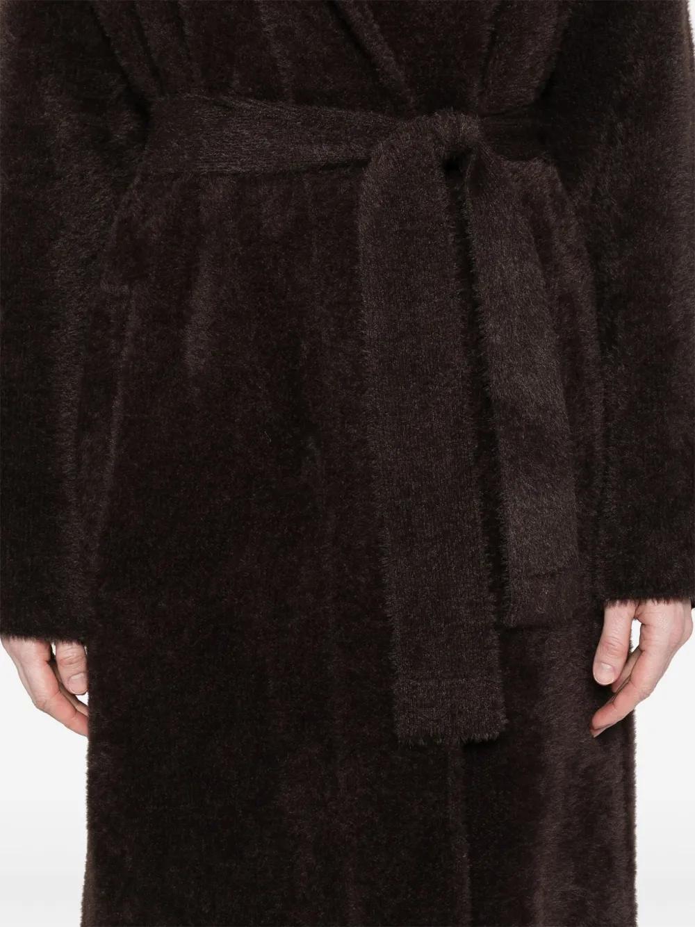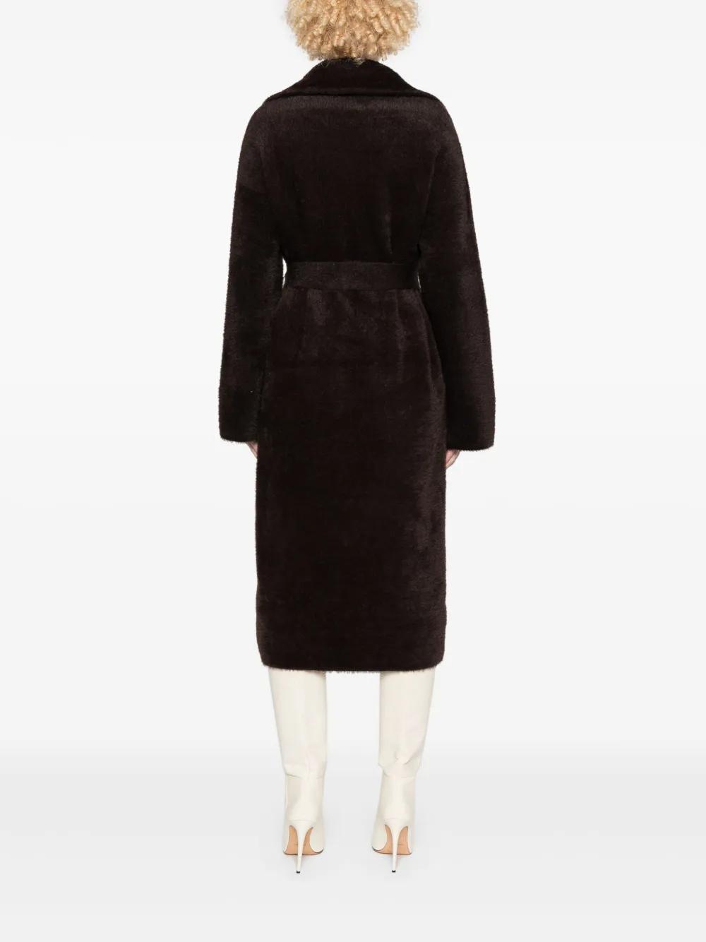 dark brown faux-fur design notched lapels long sleeves two side slit pockets detachable belt unlined straight hem double-breasted press-stud fastening