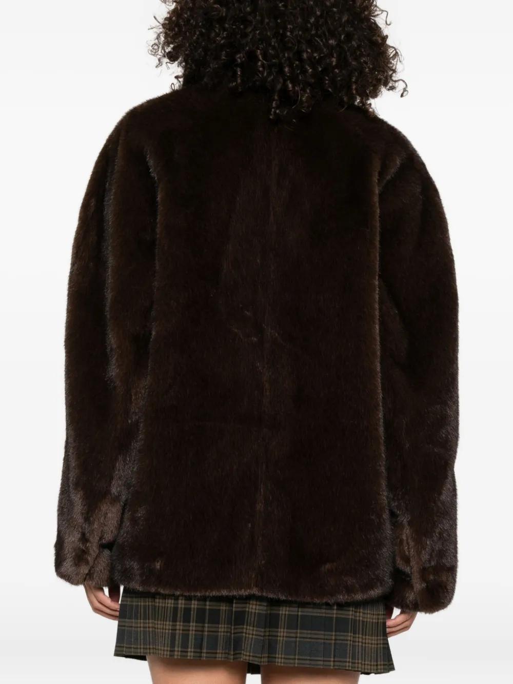 brown faux fur notched lapel button fastening welt pockets long sleeves