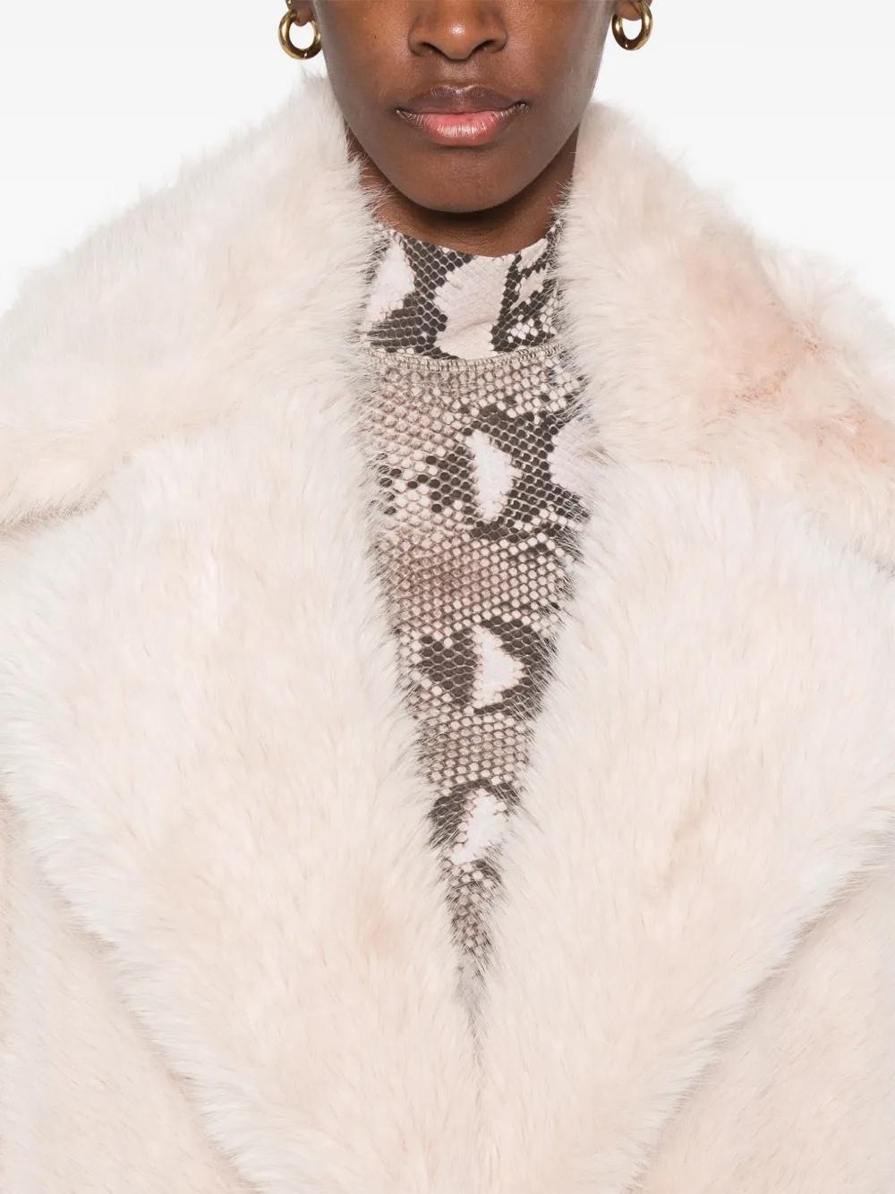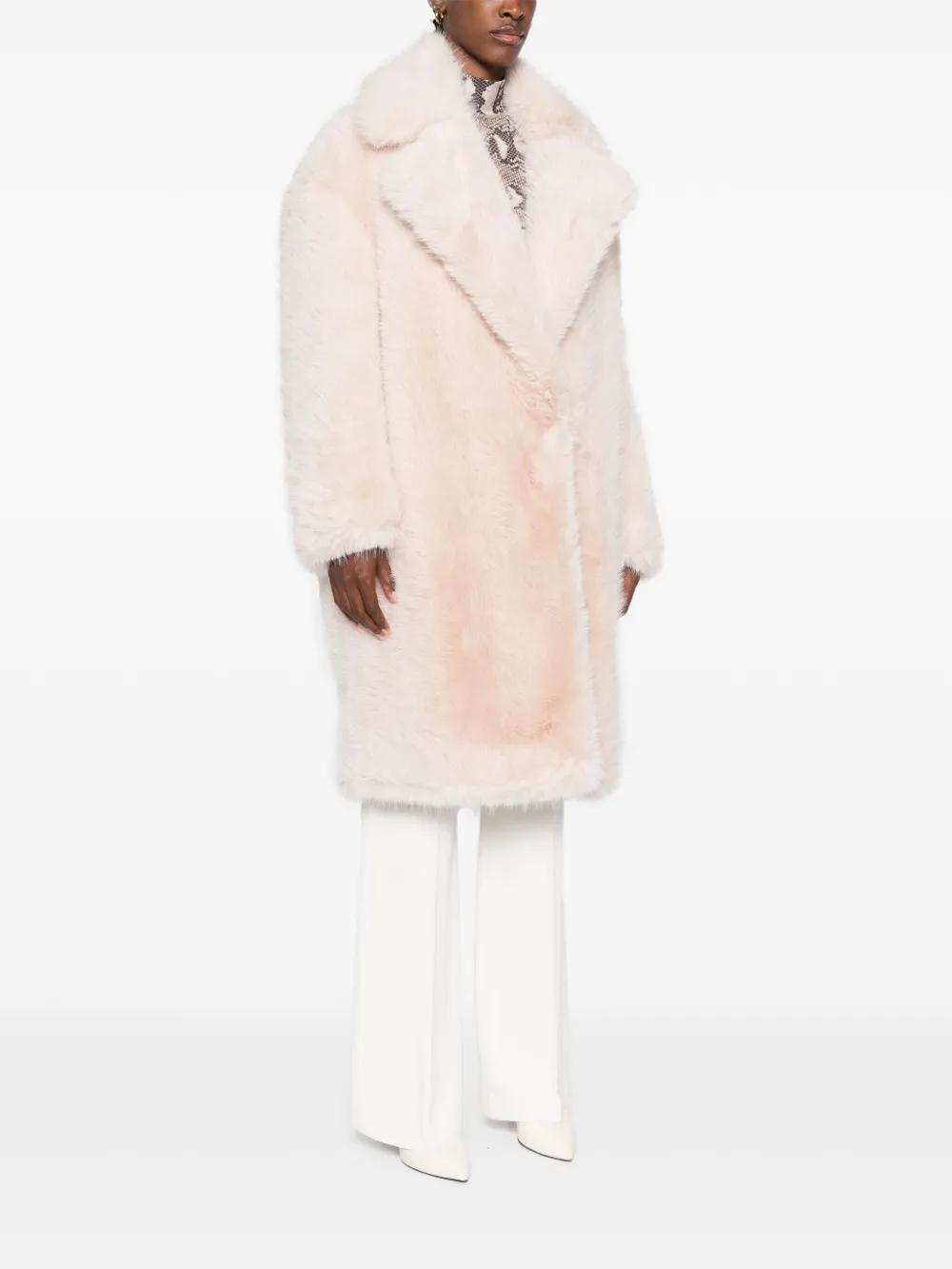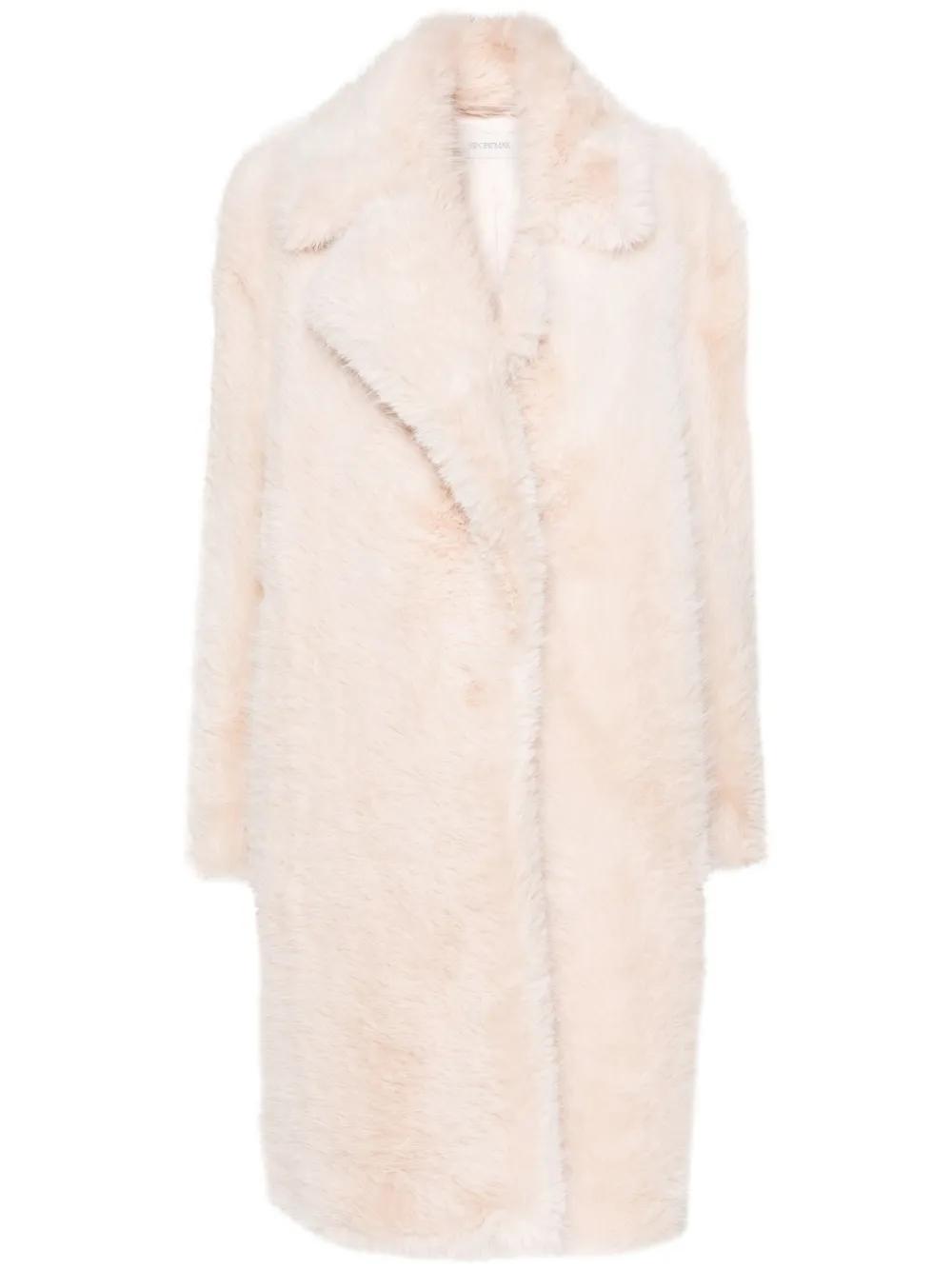 light pink faux-fur design wide notch lapels concealed front fastening long sleeves mid-length straight hem