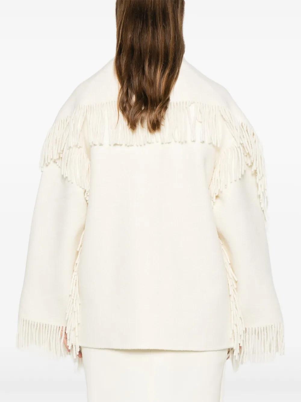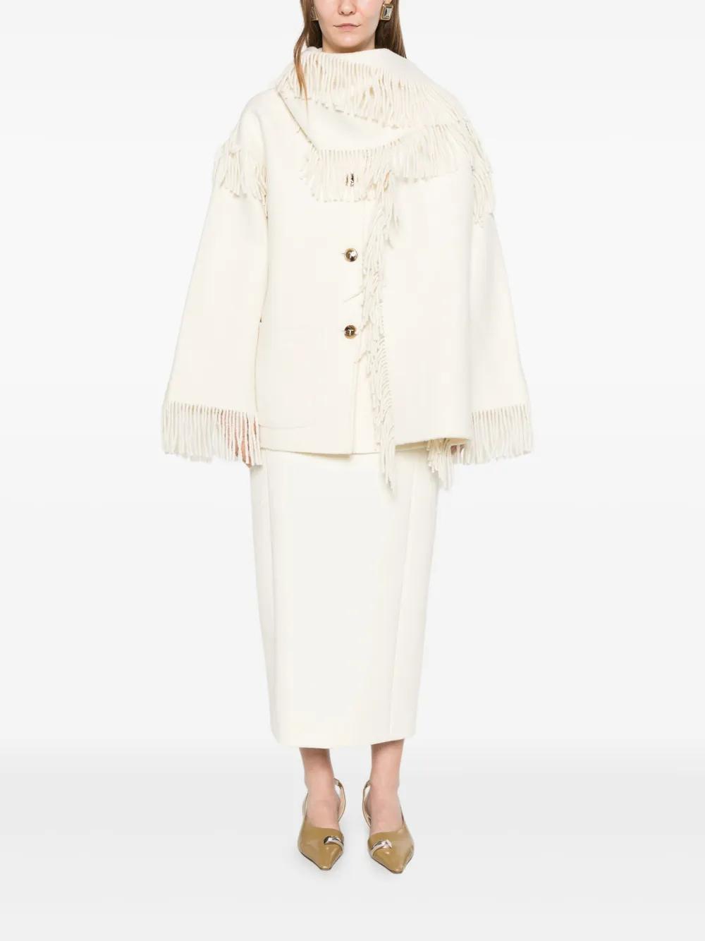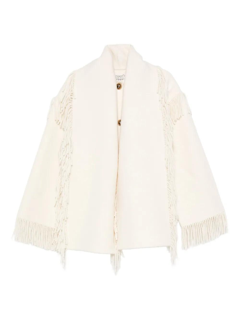 off-white fringe detailing button fastening shawl lapels wide sleeves straight hem