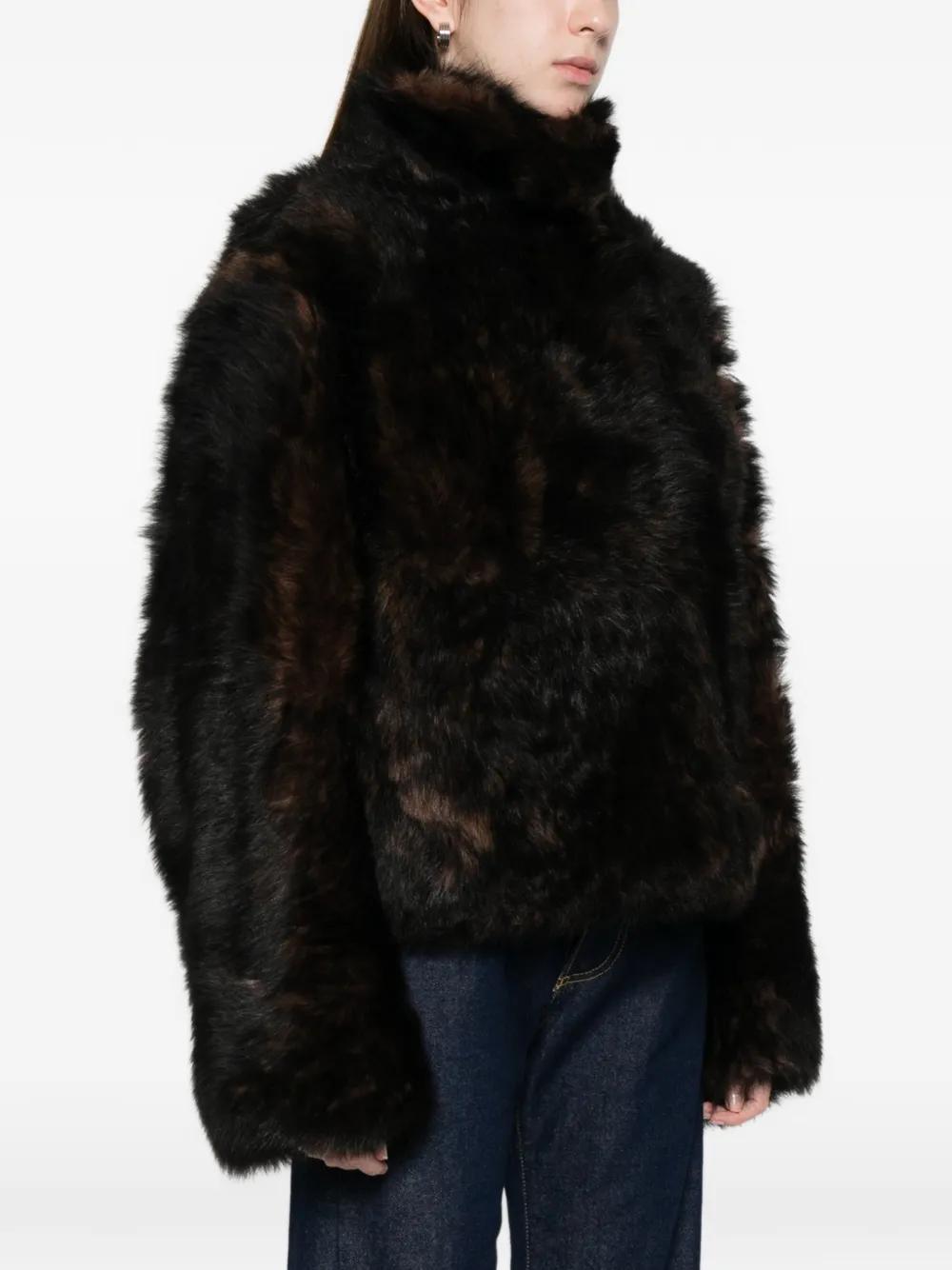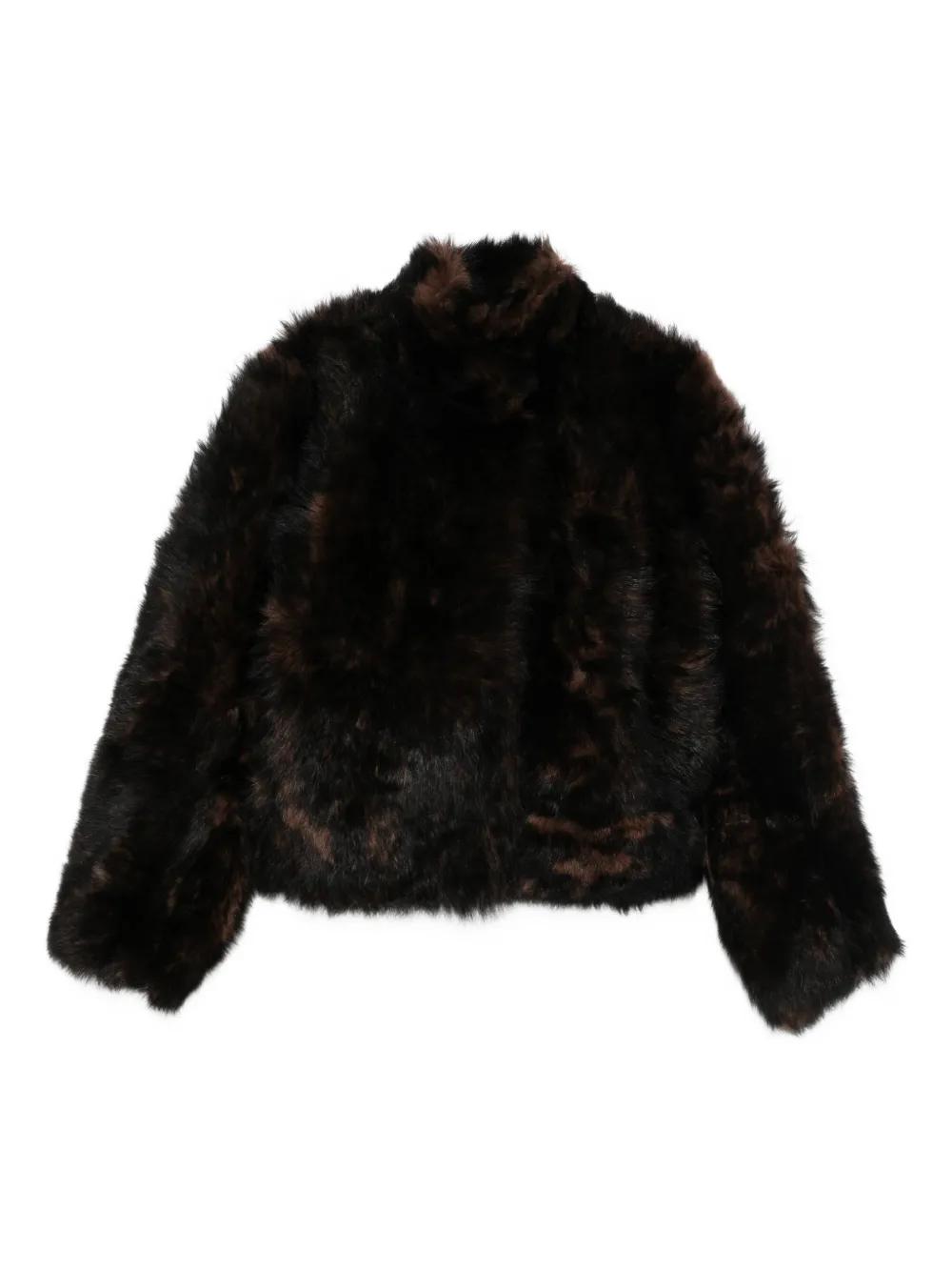 brown faux-fur design brushed finish rounded collar concealed hook fastening drop shoulders long sleeves