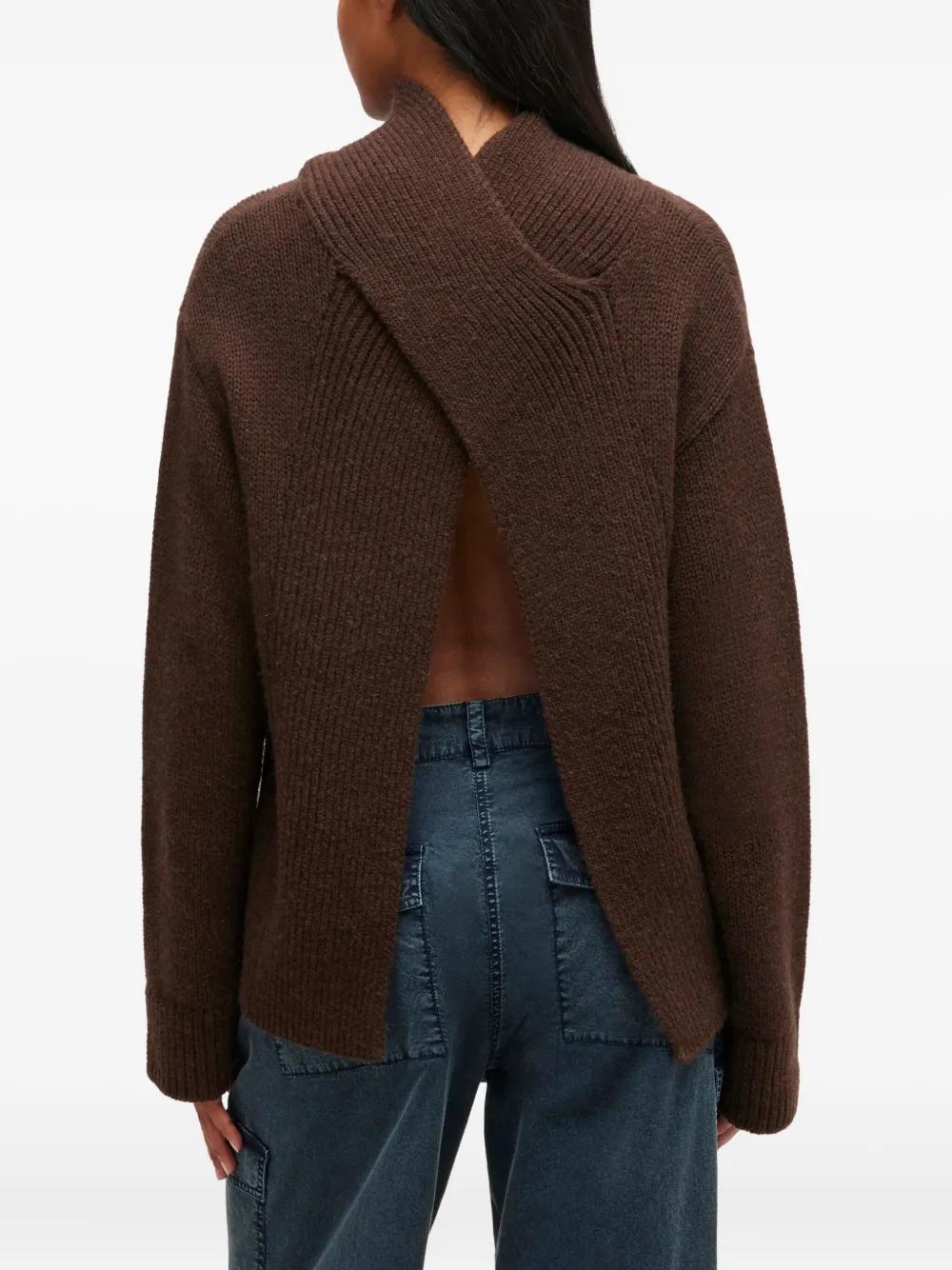 brown cable knit asymmetric hem long sleeves crew neck embroidered logo