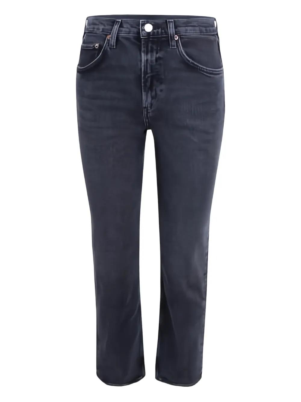 dark grey button fastening belt loops five pockets tonal stitching straight leg