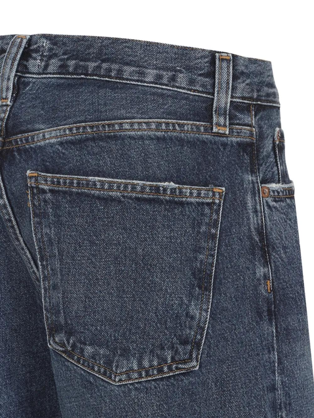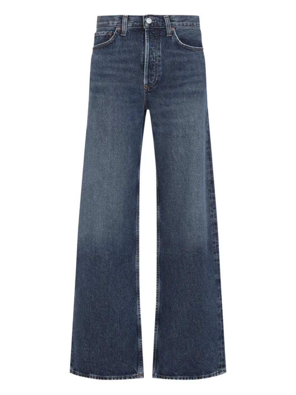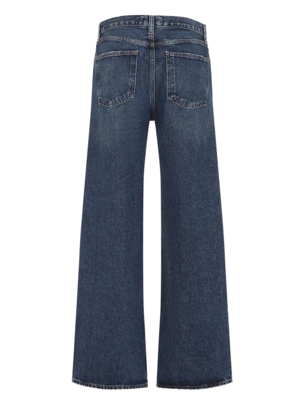 blue wide leg seam detail classic five pockets belt loops button and fly fastening