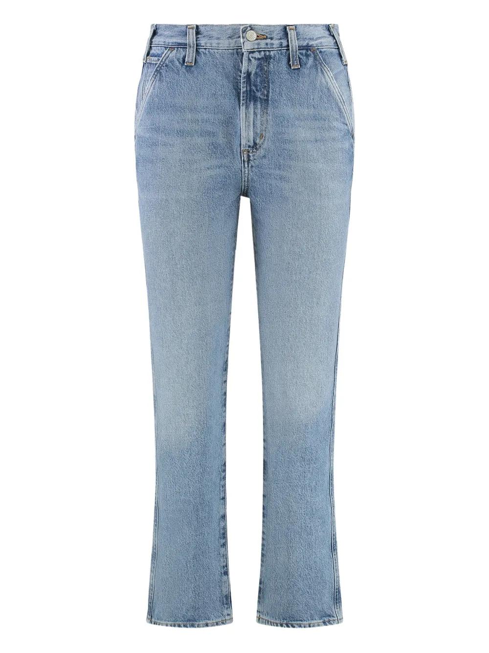 blue cotton ripped detailing silver-tone logo plaque high-waisted front button fastening classic five pockets slim cut