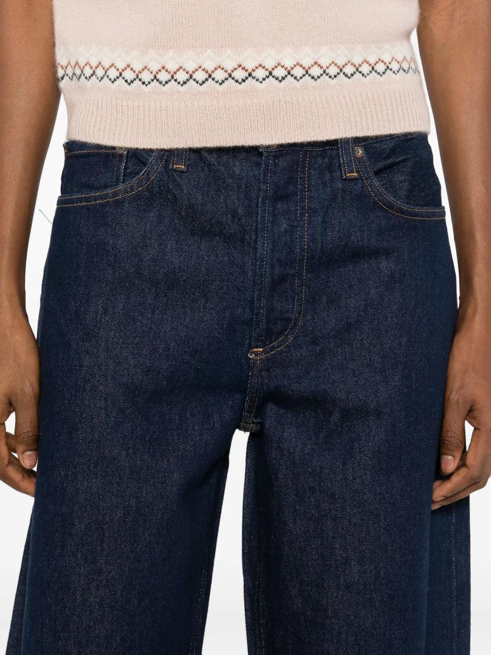 midnight blue belt loops classic five pockets rear logo patch top button closure