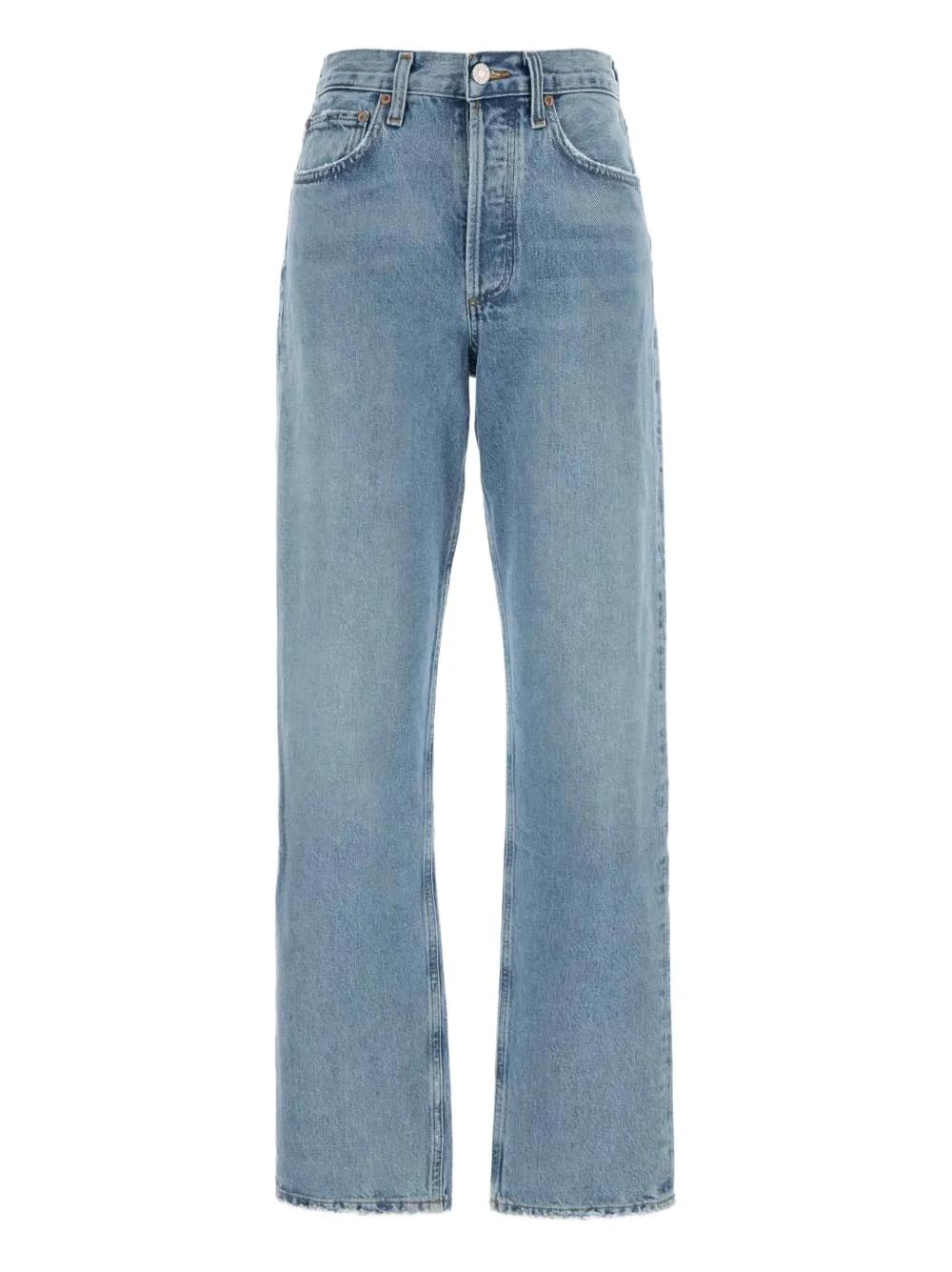 light blue concealed fly and button fastening belt loops classic five pockets logo patch to the rear