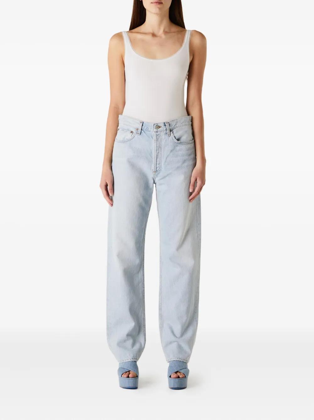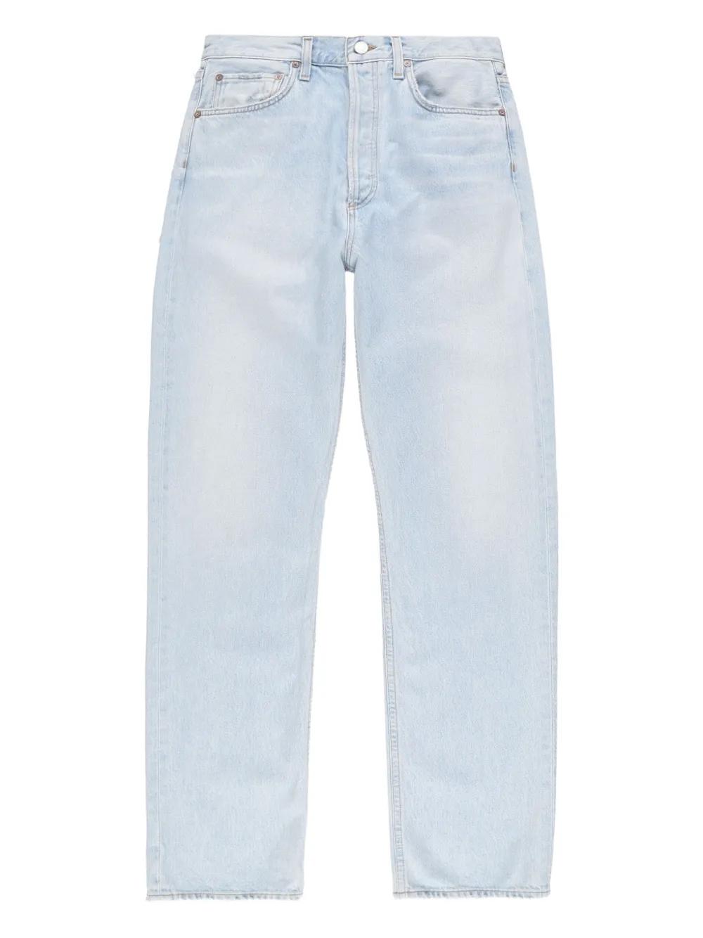 light blue concealed fly and button fastening classic five pockets belt loops contrast stitching