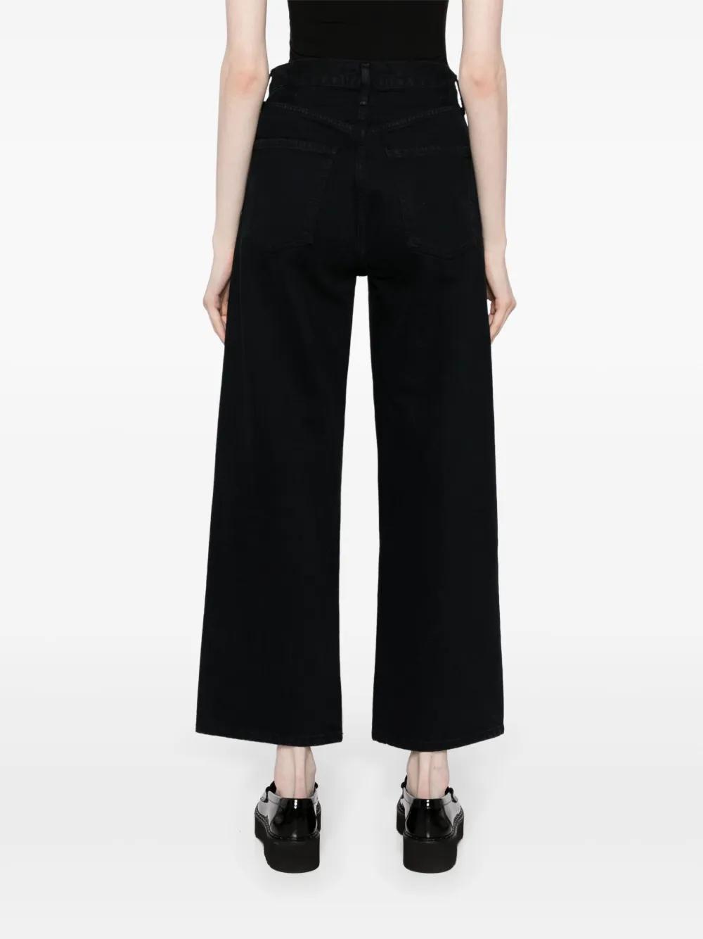 black cotton denim high-waisted concealed fly and button fastening belt loops classic five pockets logo patch to the rear wide leg cropped