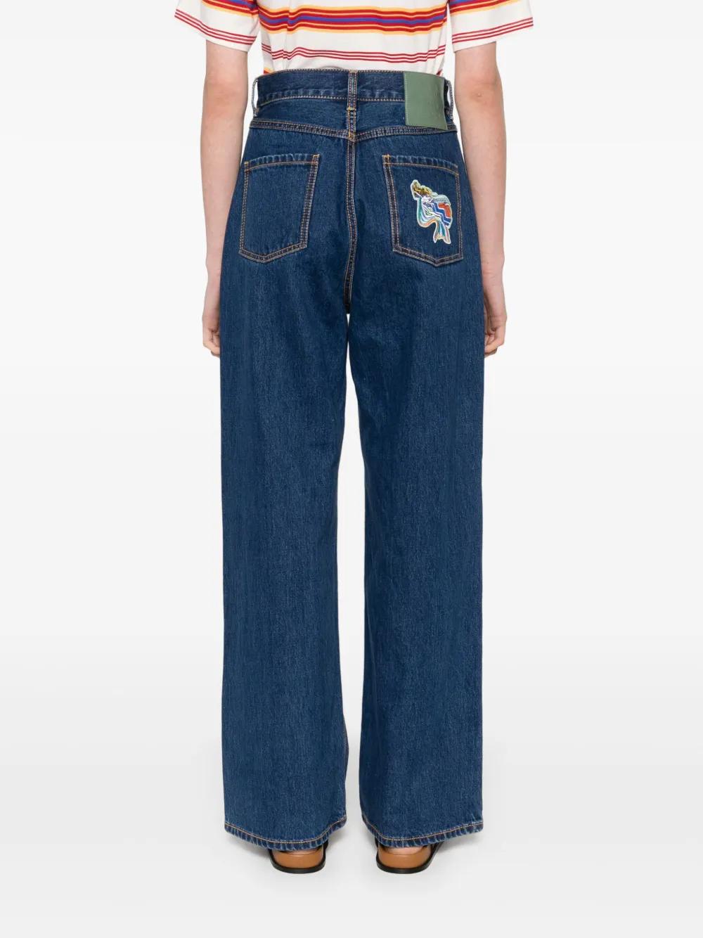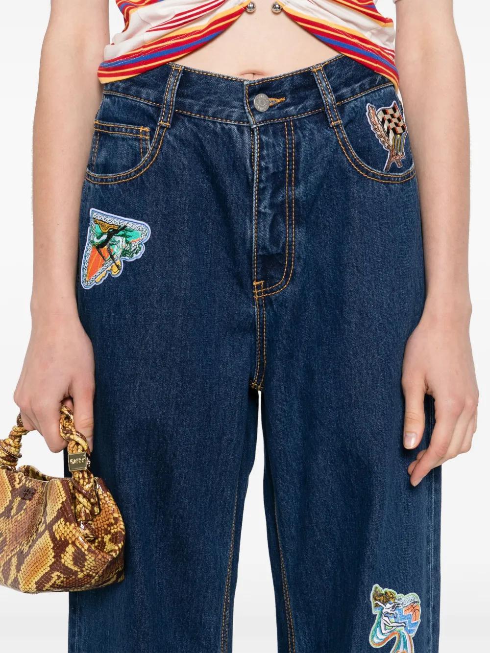 blue button and zip front fastening embroidered patches straight leg high-rise rear logo patch classic five pockets
