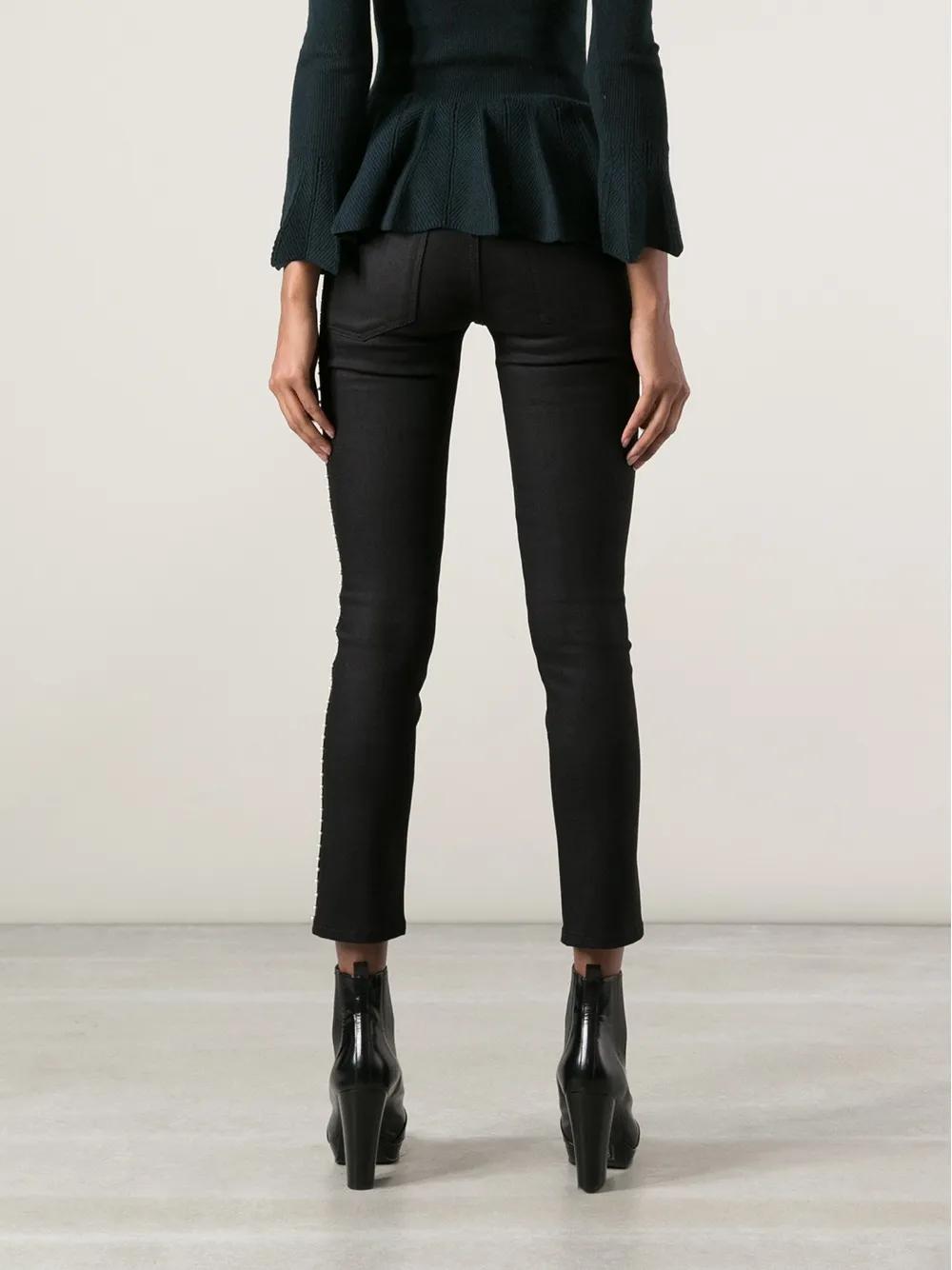 Black Synthetic->Spandex/Elastane skinny jeans from Alexander McQueen featuring a low rise, belt loops, a button and zip fly, a five pocket design, a metal skull embellishment on the side pocket, silver-tone studs down the sides and a skinny fit.
