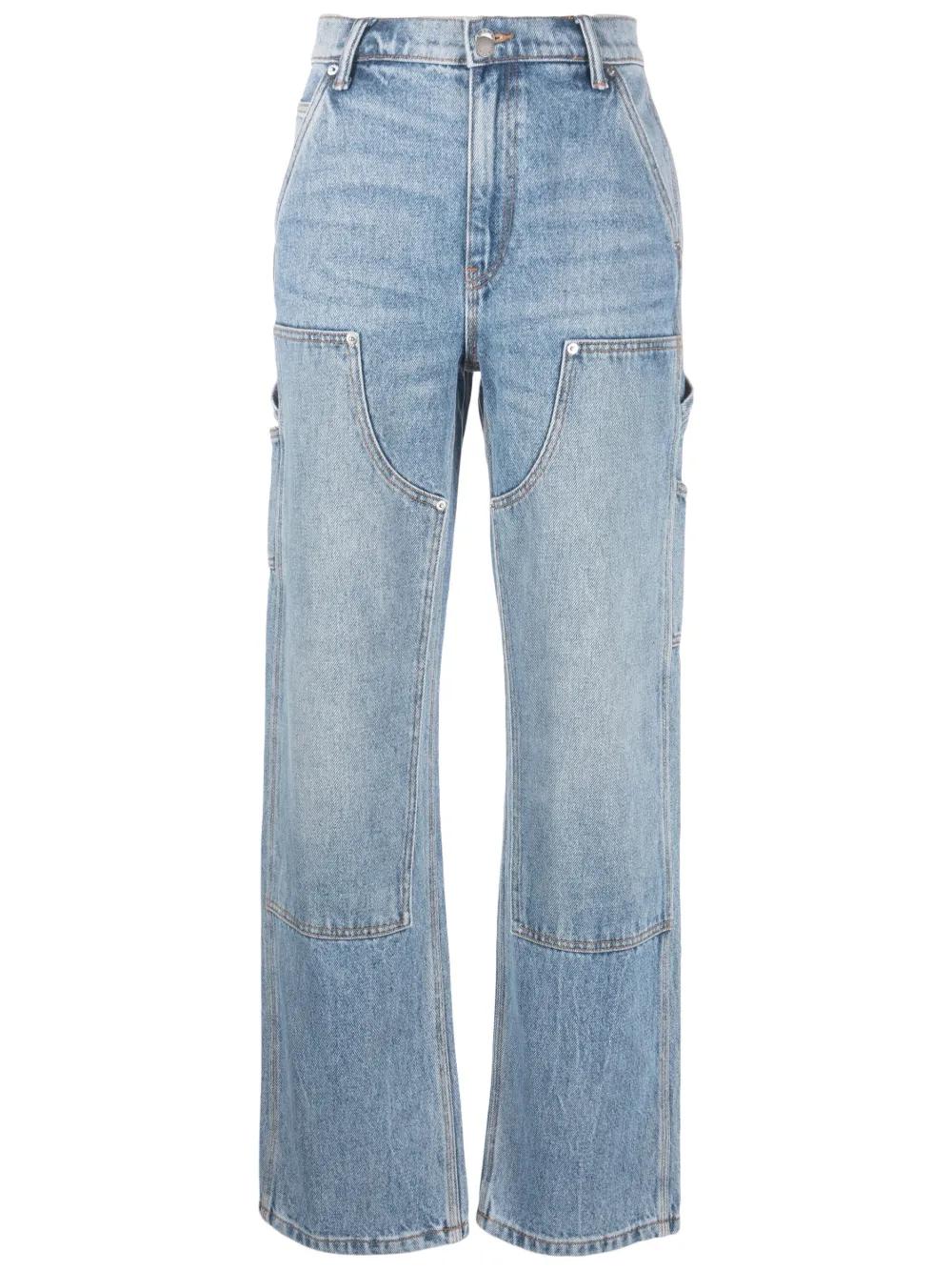 light blue cotton washed denim mid-rise front button and zip fastening hammer loop two side inset pockets carpenter side pockets two rear patch pockets straight leg
