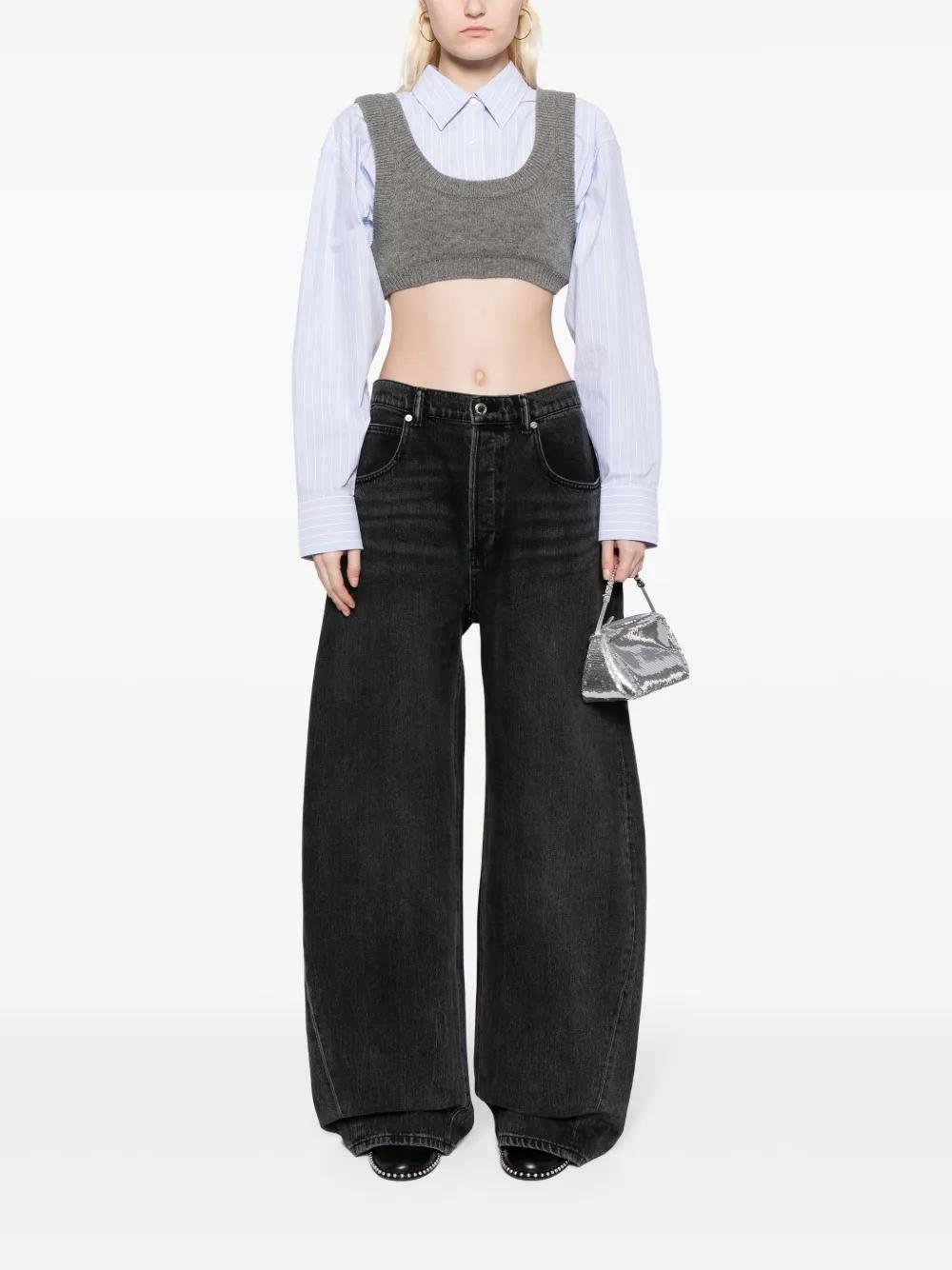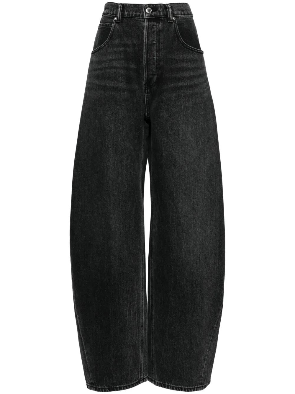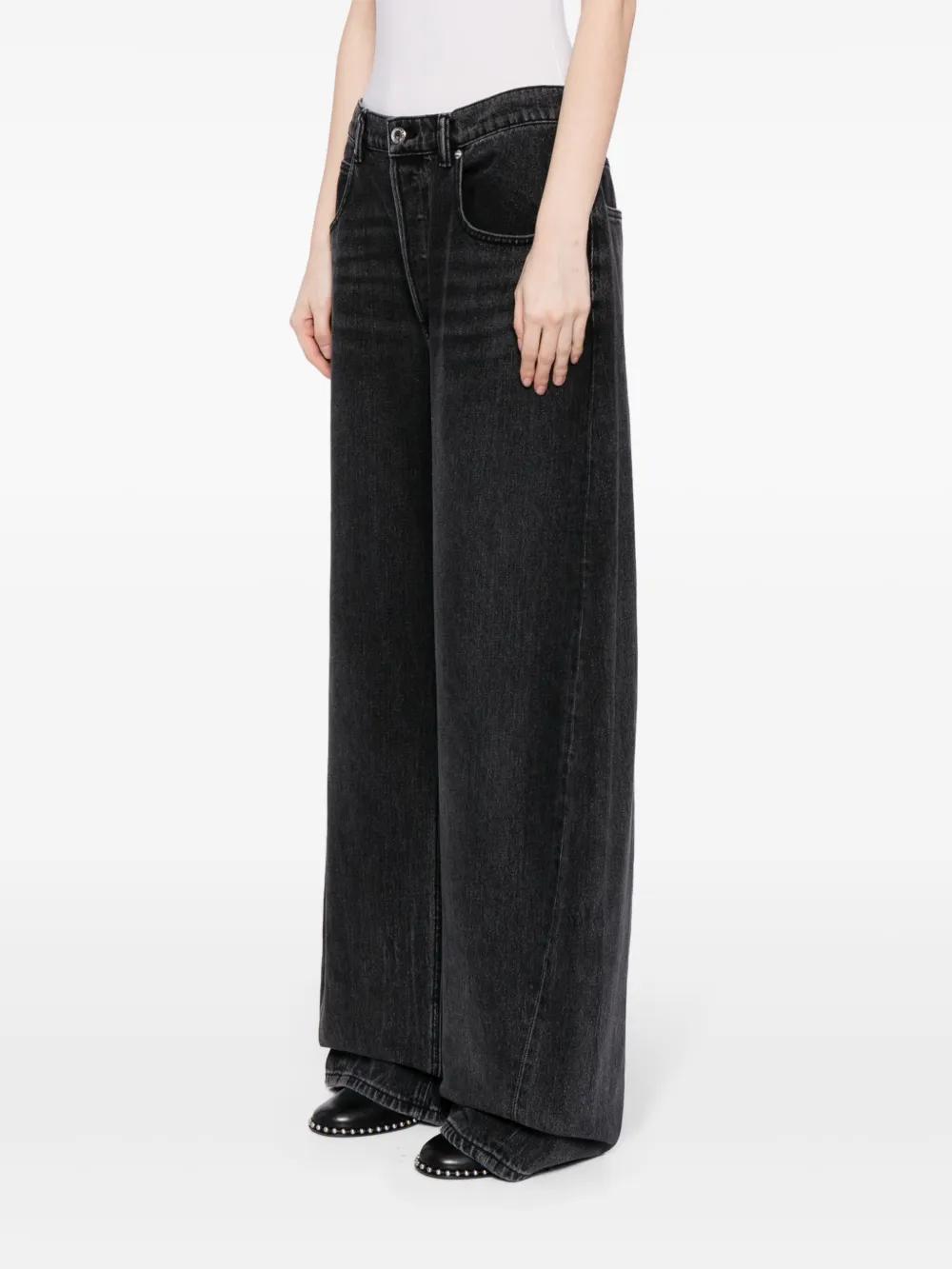 black cotton logo patch to the rear whiskering effect at the thighs wide leg low-rise concealed fly and button fastening belt loops classic five pockets