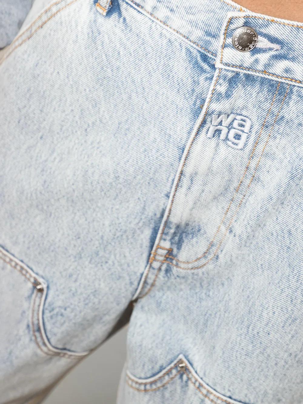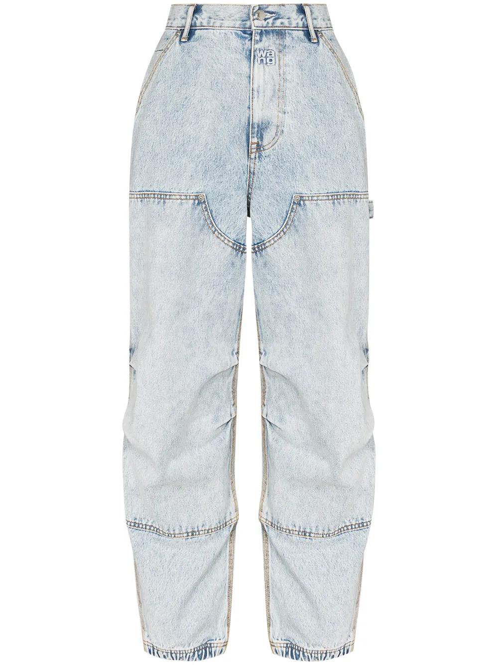 bleach blue cotton high-waisted button fly fastening belt loops embroidered logo to the front two side slit pockets two rear pouch pockets