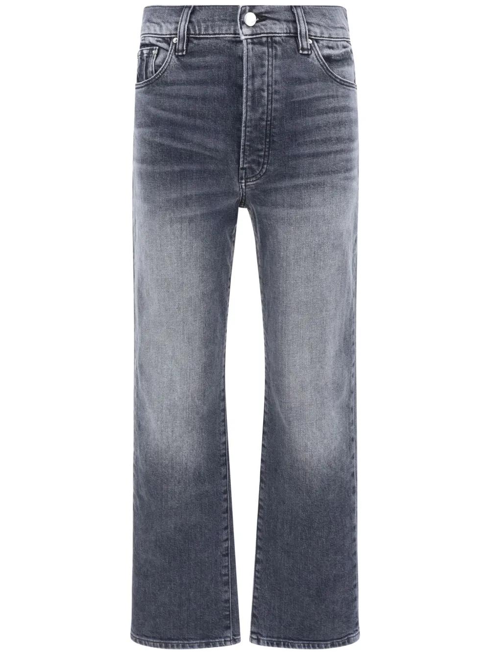 black cotton washed denim whiskering effect at the thighs belt loops high-rise straight leg concealed fly and button fastening classic five pockets
