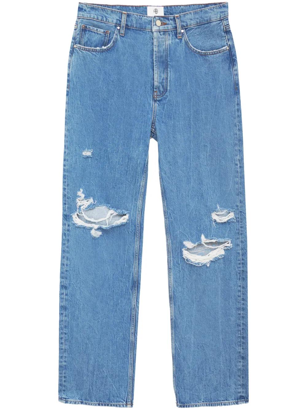 light blue organic cotton blend straight leg ripped detailing logo patch to the rear high waist belt loops front button and zip fastening classic five pockets