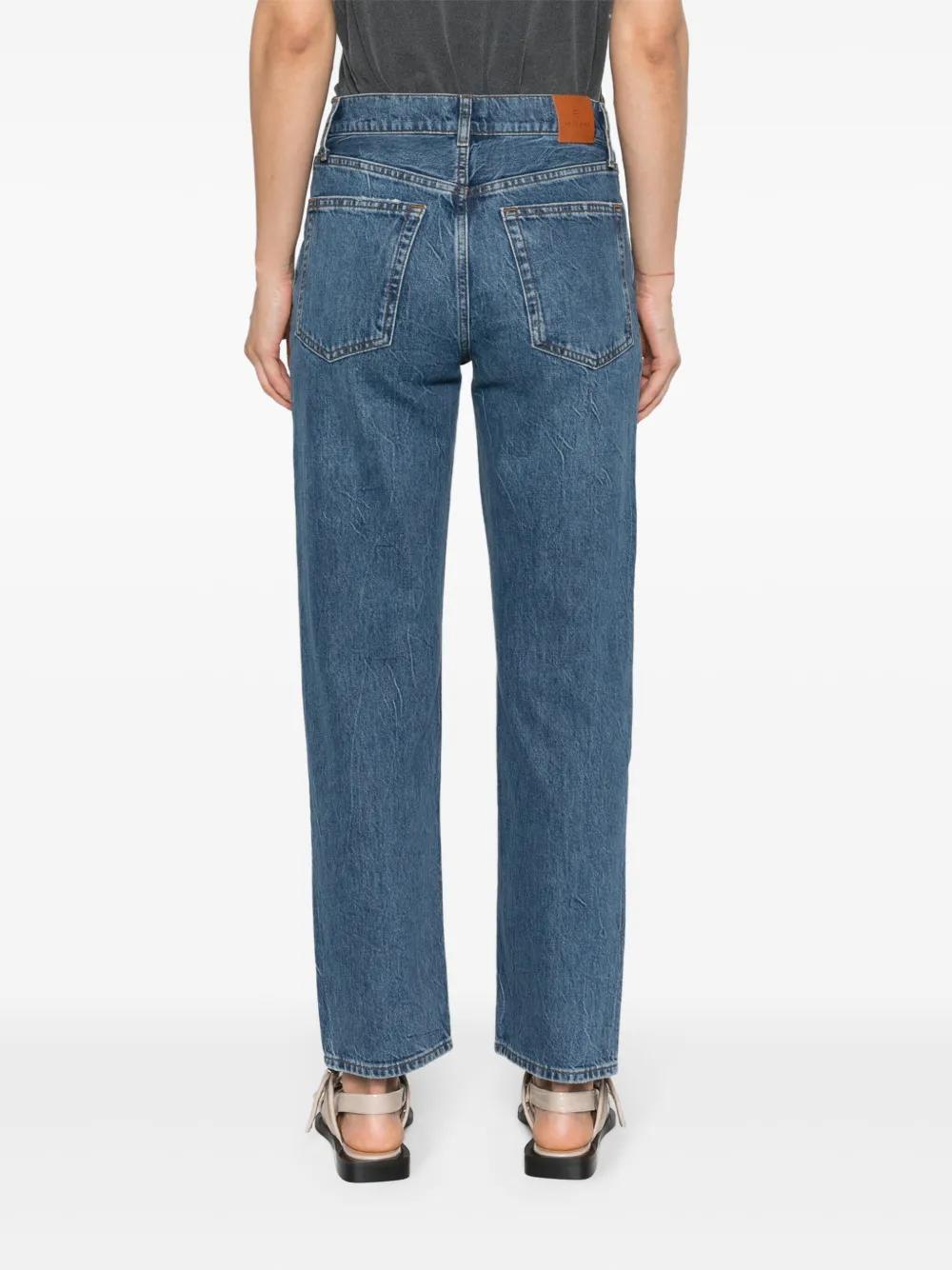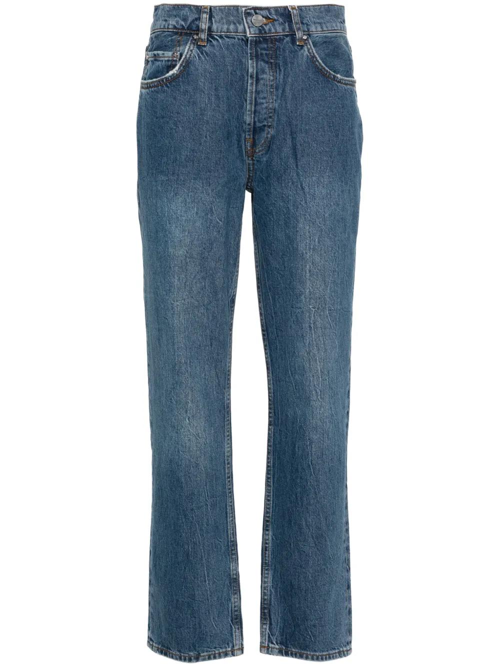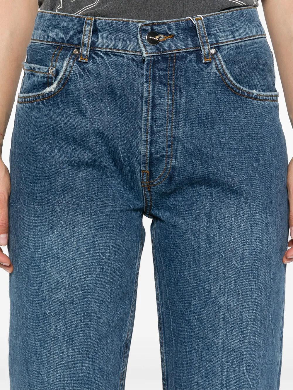 marine blue organic cotton blend washed denim contrast stitching logo patch to the rear concealed front button fastening belt loops boyfriend cut classic five pockets