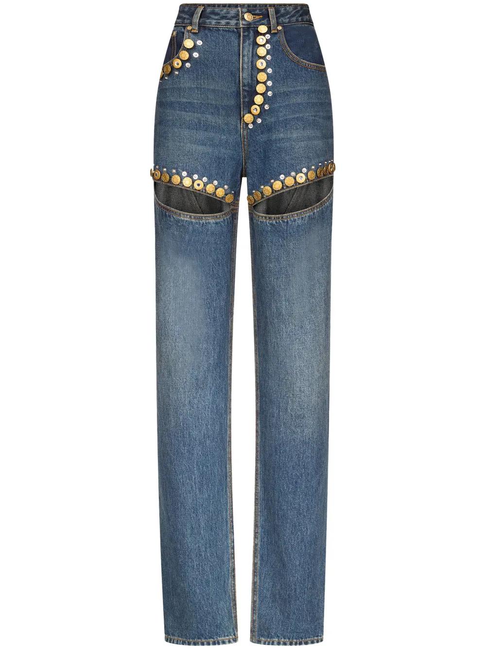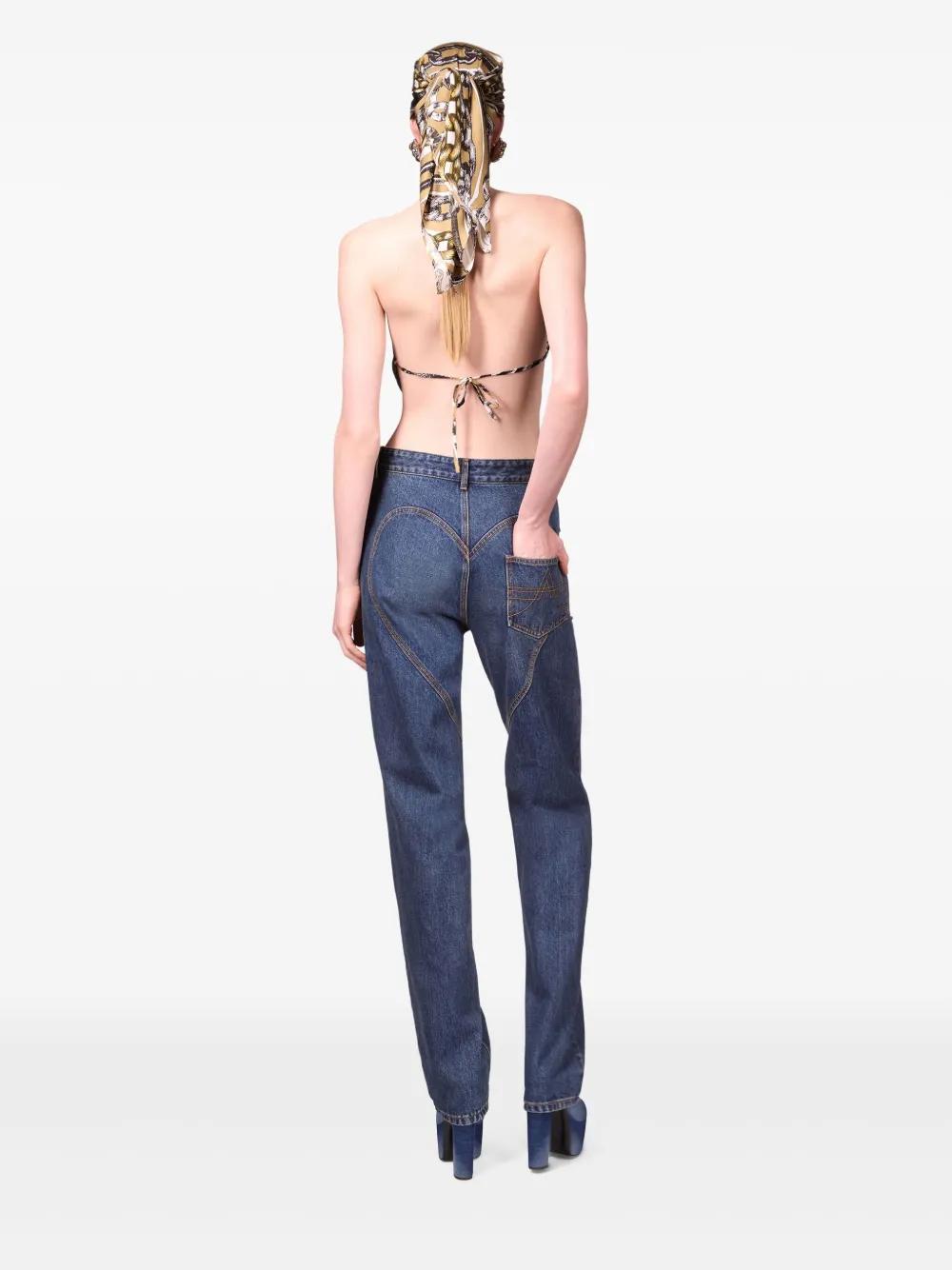indigo blue concealed fly and button fastening classic five pockets belt loops cut-out detailing