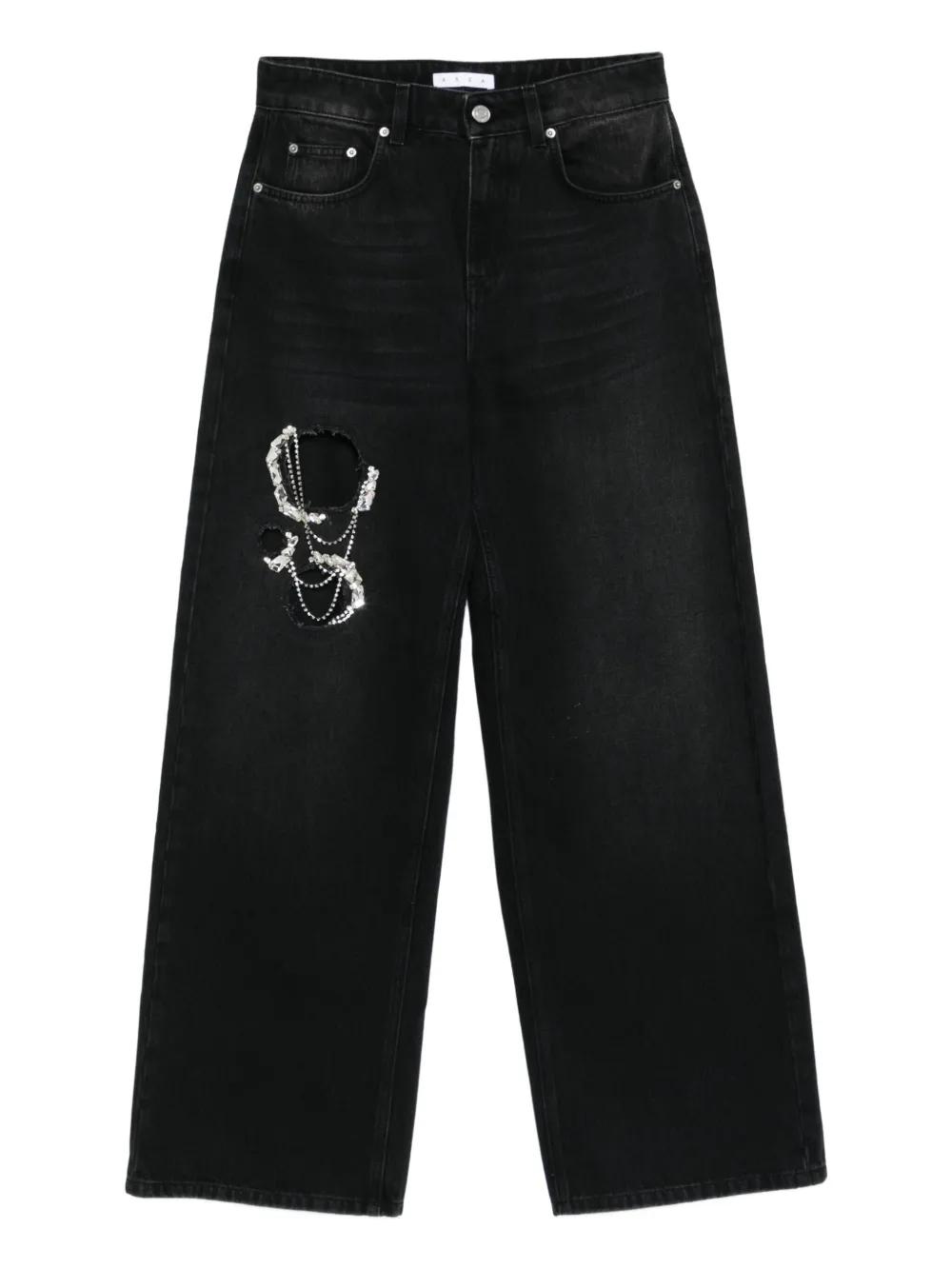 indigo blue cotton blend washed denim whiskering effect rhinestone embellishment appliqué logo belt loops classic five pockets concealed fly and button fastening cropped leg super-skinny cut