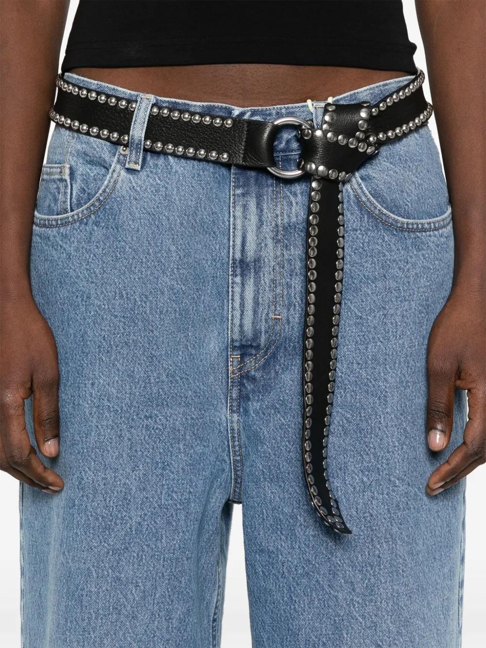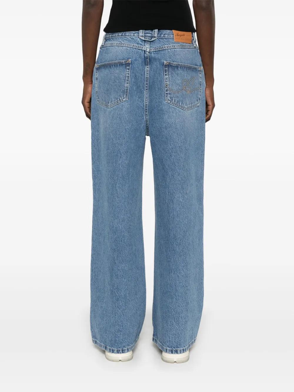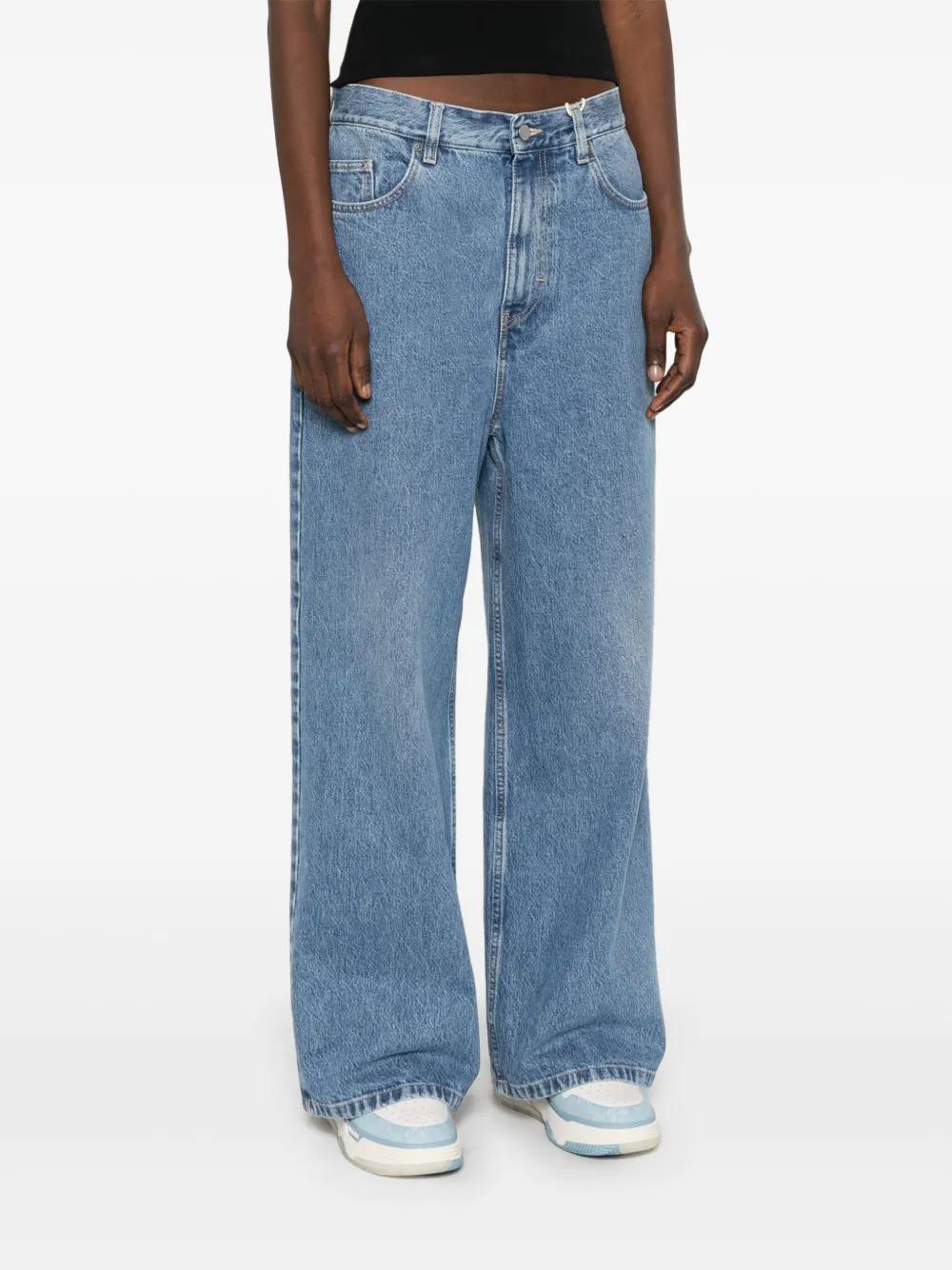 light blue front button and zip fastening belt loops classic five pockets logo patch to the rear