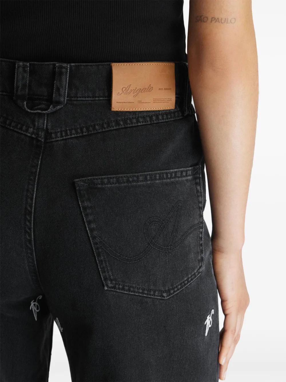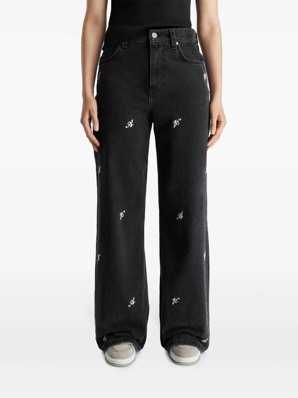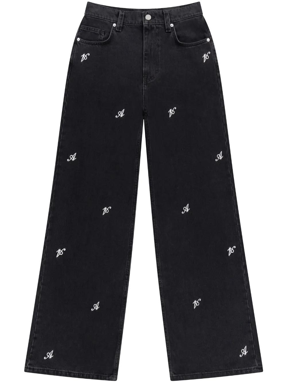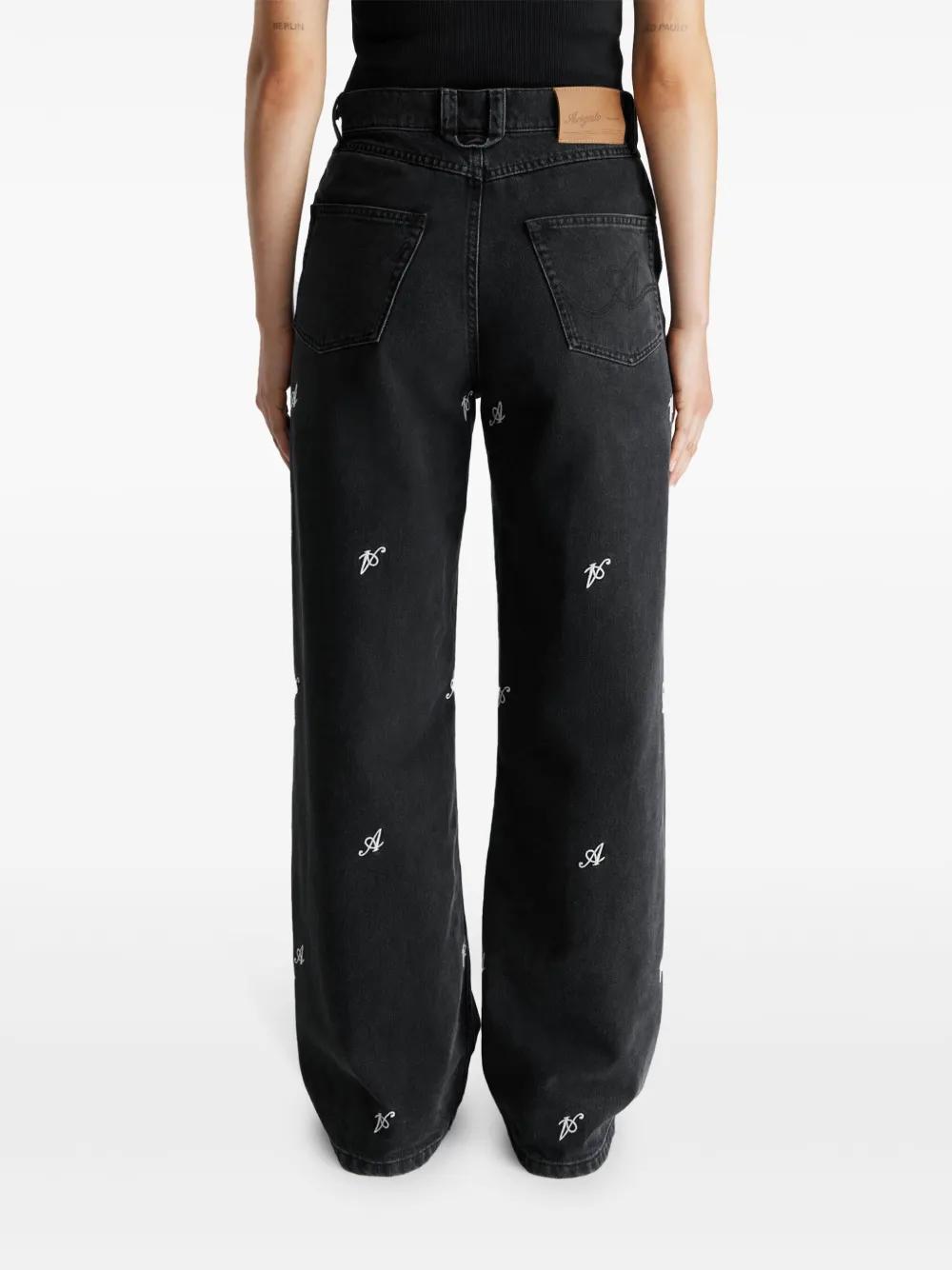 black cotton washed denim wide leg button fly fastening all-over Signature A embroidery belt loops classic five pockets logo patch to the rear floor-length