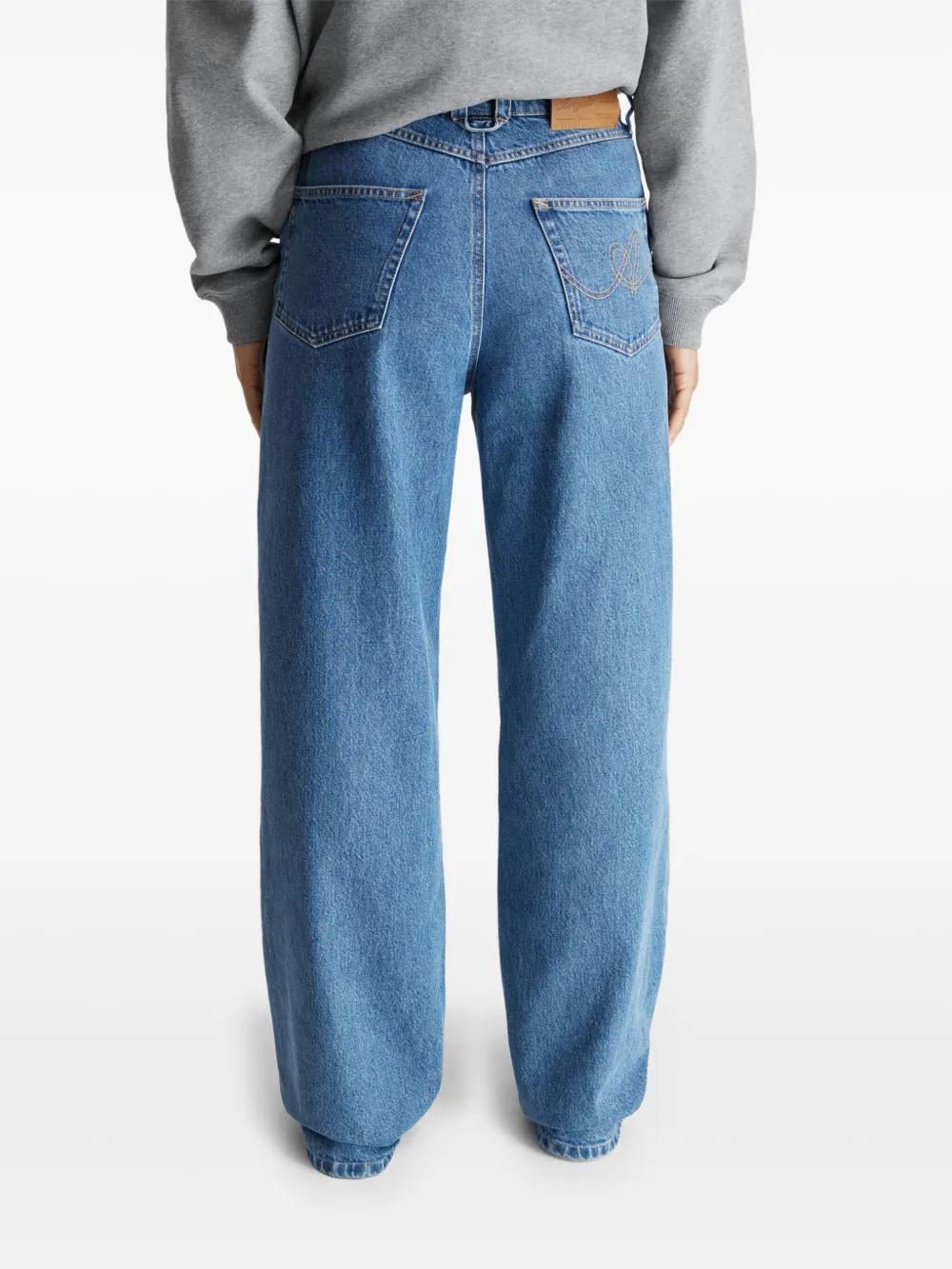 blue cotton washed denim button fly fastening belt loops classic five pockets logo patch to the rear contrast signature double-stitch logo wide leg floor-length