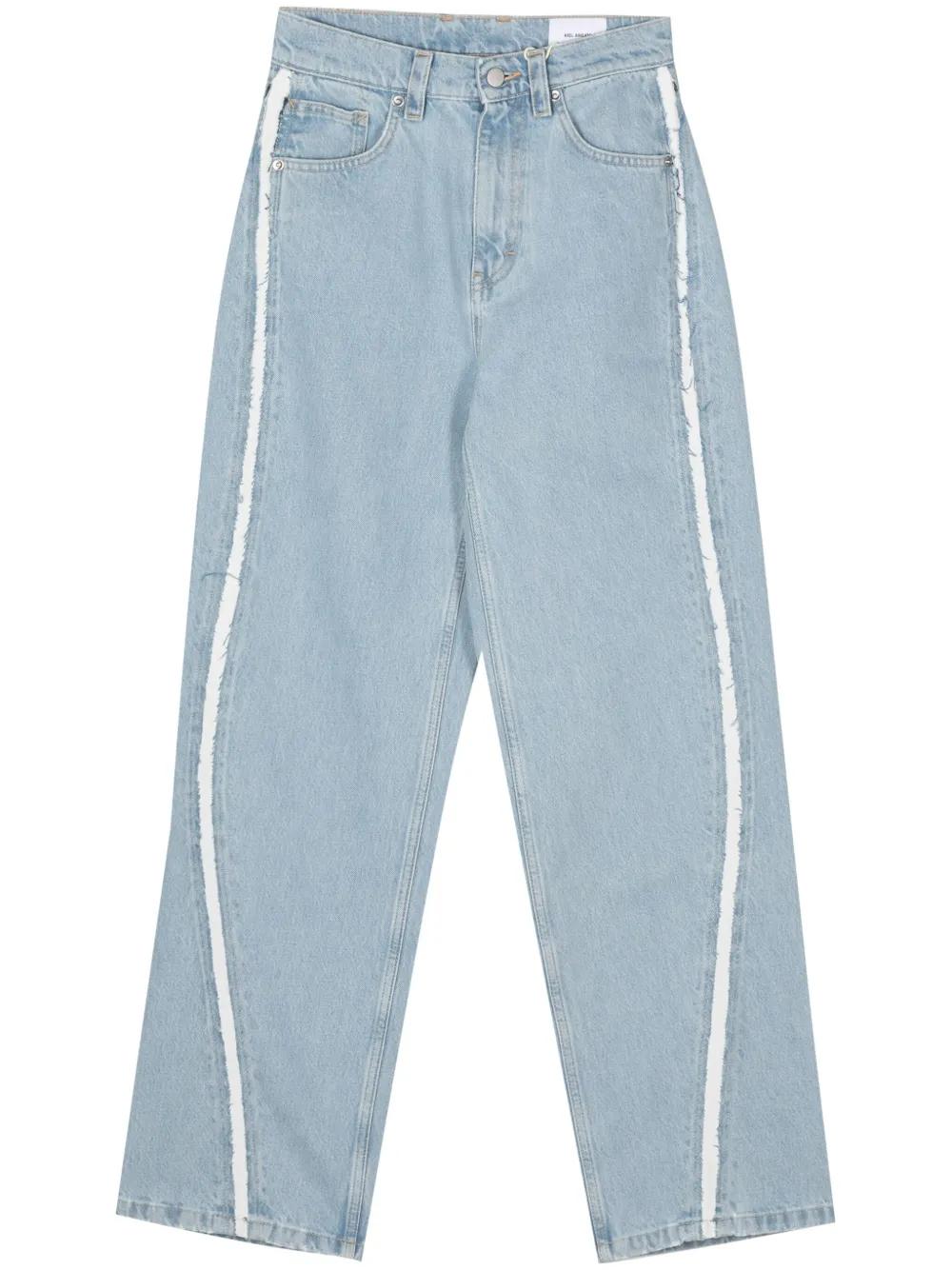 light blue cotton denim mid-rise belt loops classic five pockets contrasting trim logo patch to the rear straight leg concealed fly and button fastening