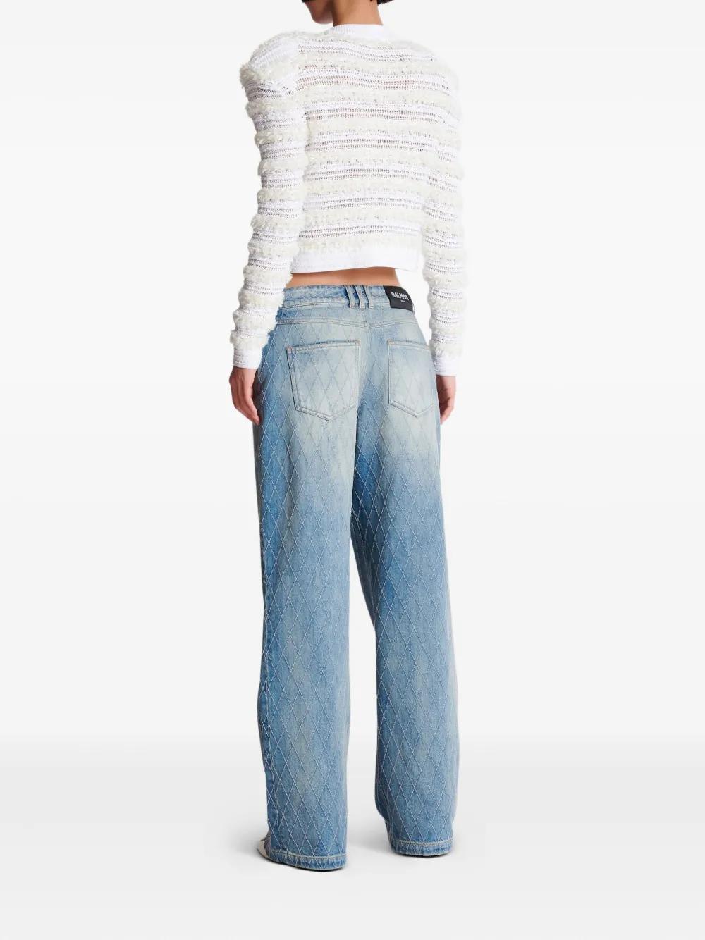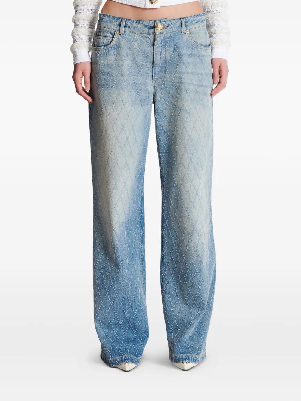 light blue concealed fly and button fastening classic five pockets logo patch to the rear