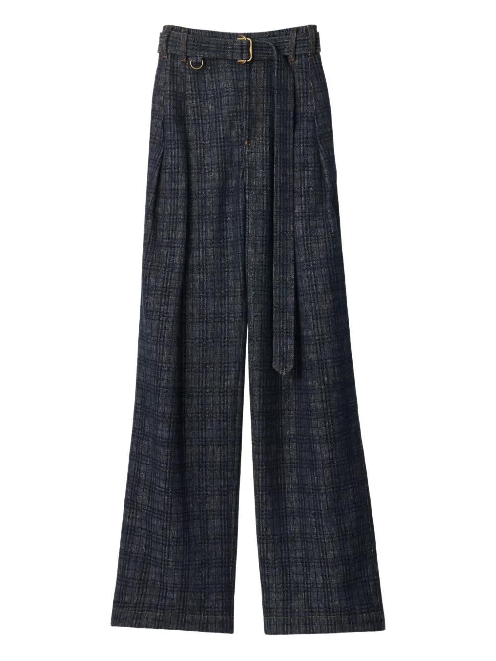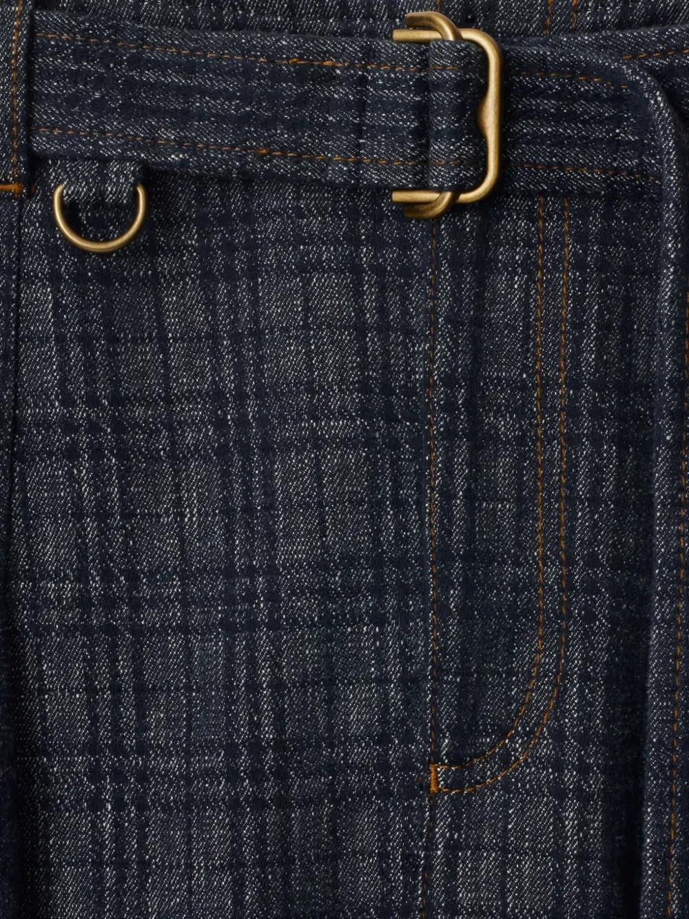 indigo blue concealed fly and button fastening belted waist two side slit pockets signature B buckle