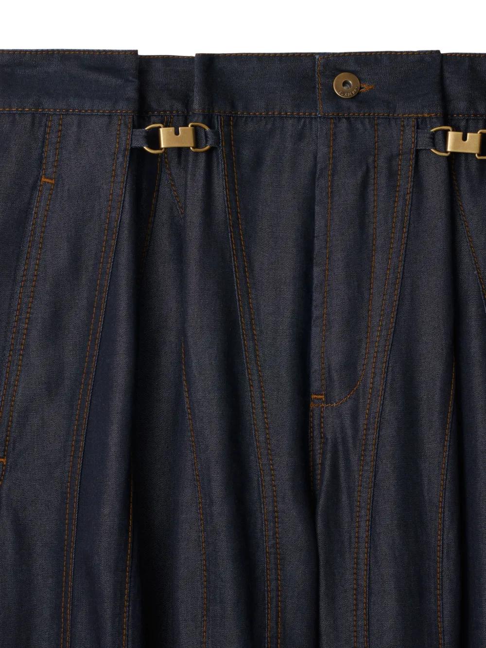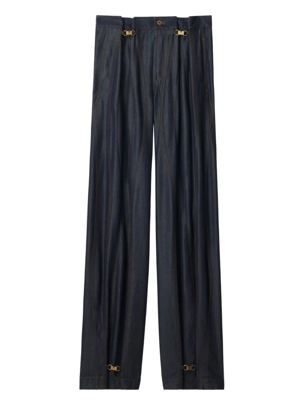 navy blue front button fastening pleat detailing two side slit pockets straight leg
