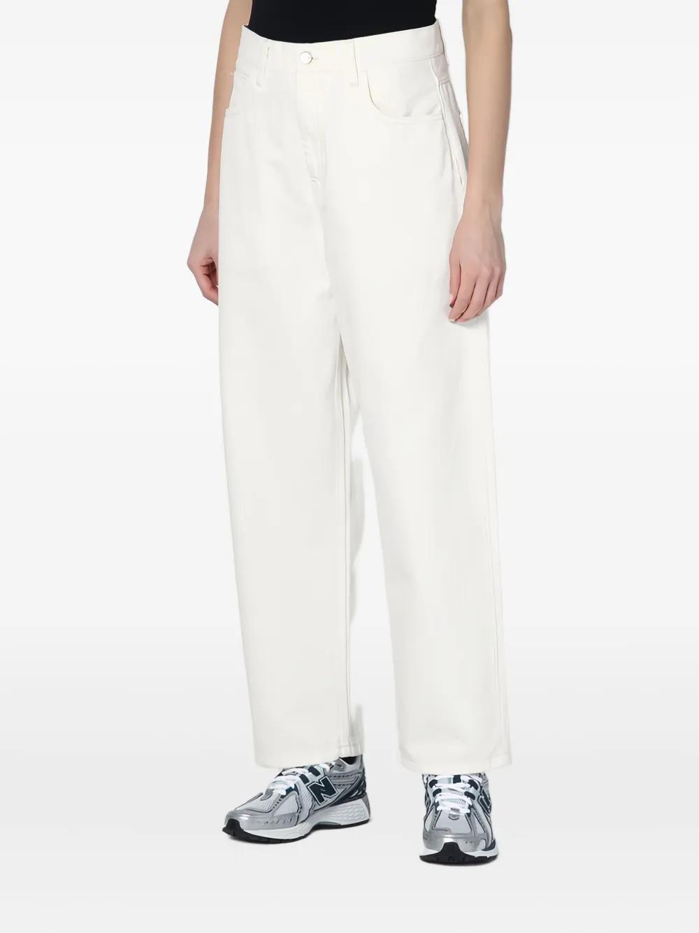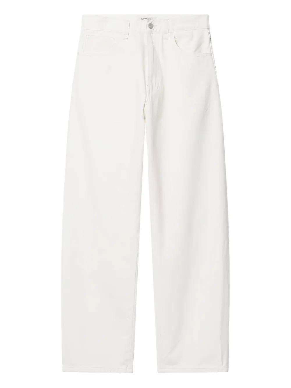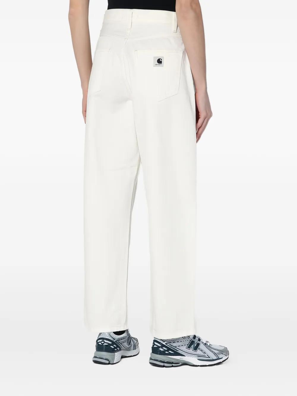 white front button and zip fastening classic five pockets belt loops logo patch to the rear