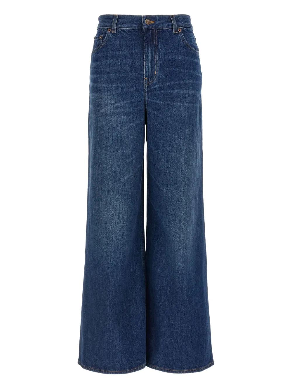 indigo blue stonewashed cotton denim classic five pockets front zip button closure leather logo label high waist