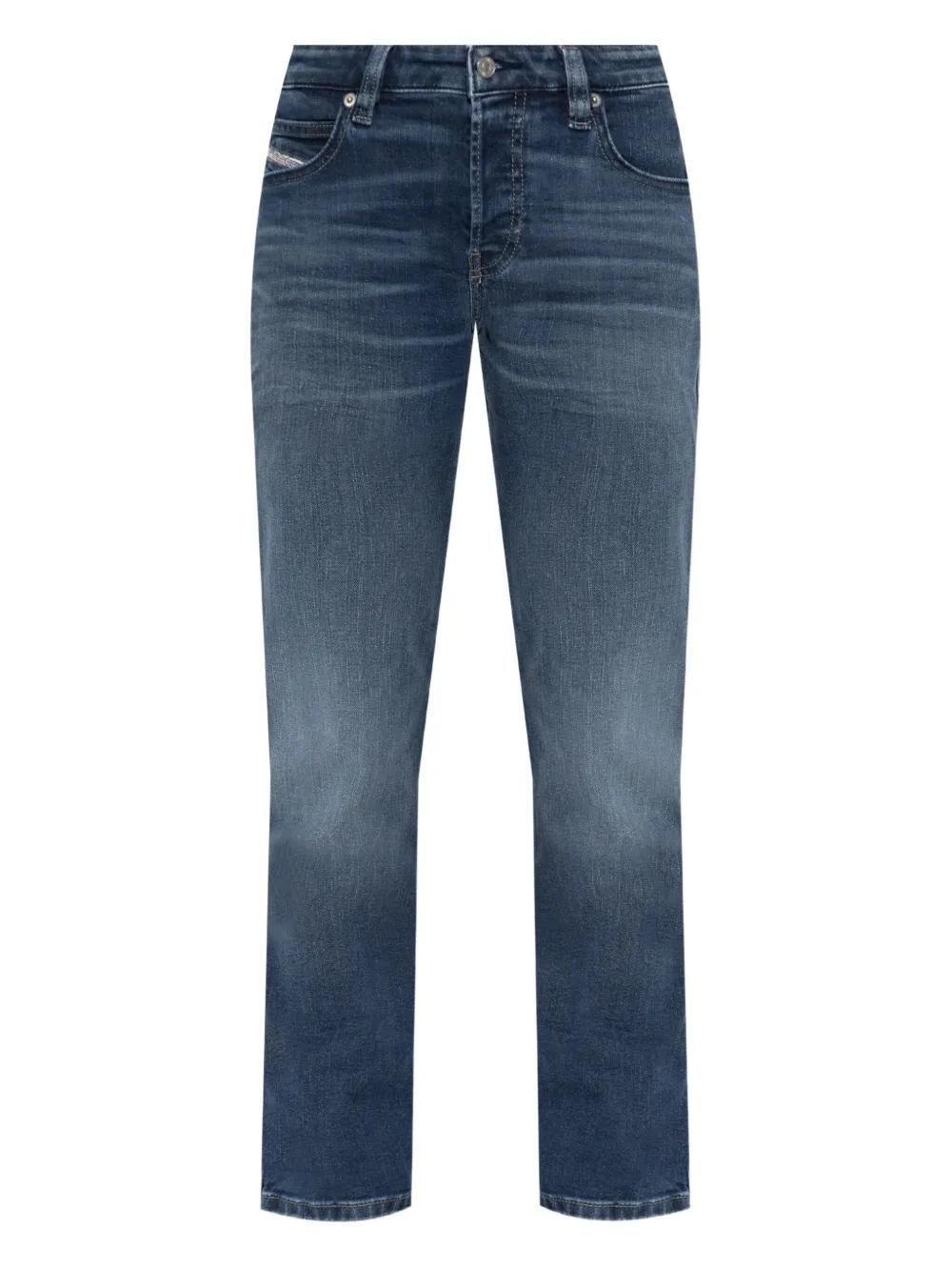 medium blue faded wash five pockets logo patch at the back button and zip fastening