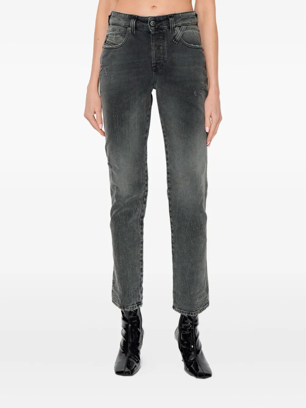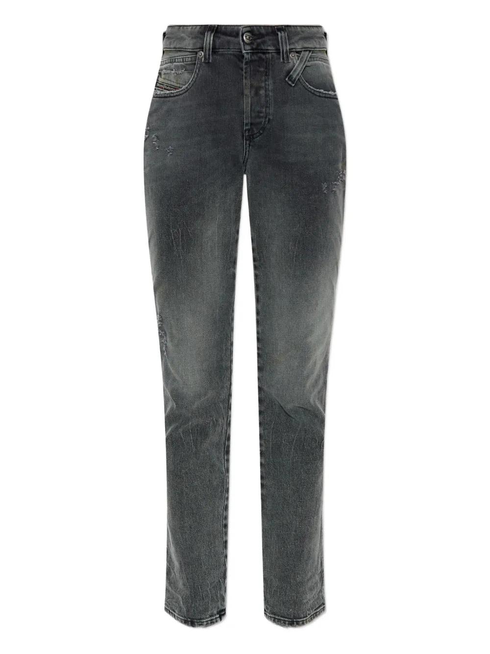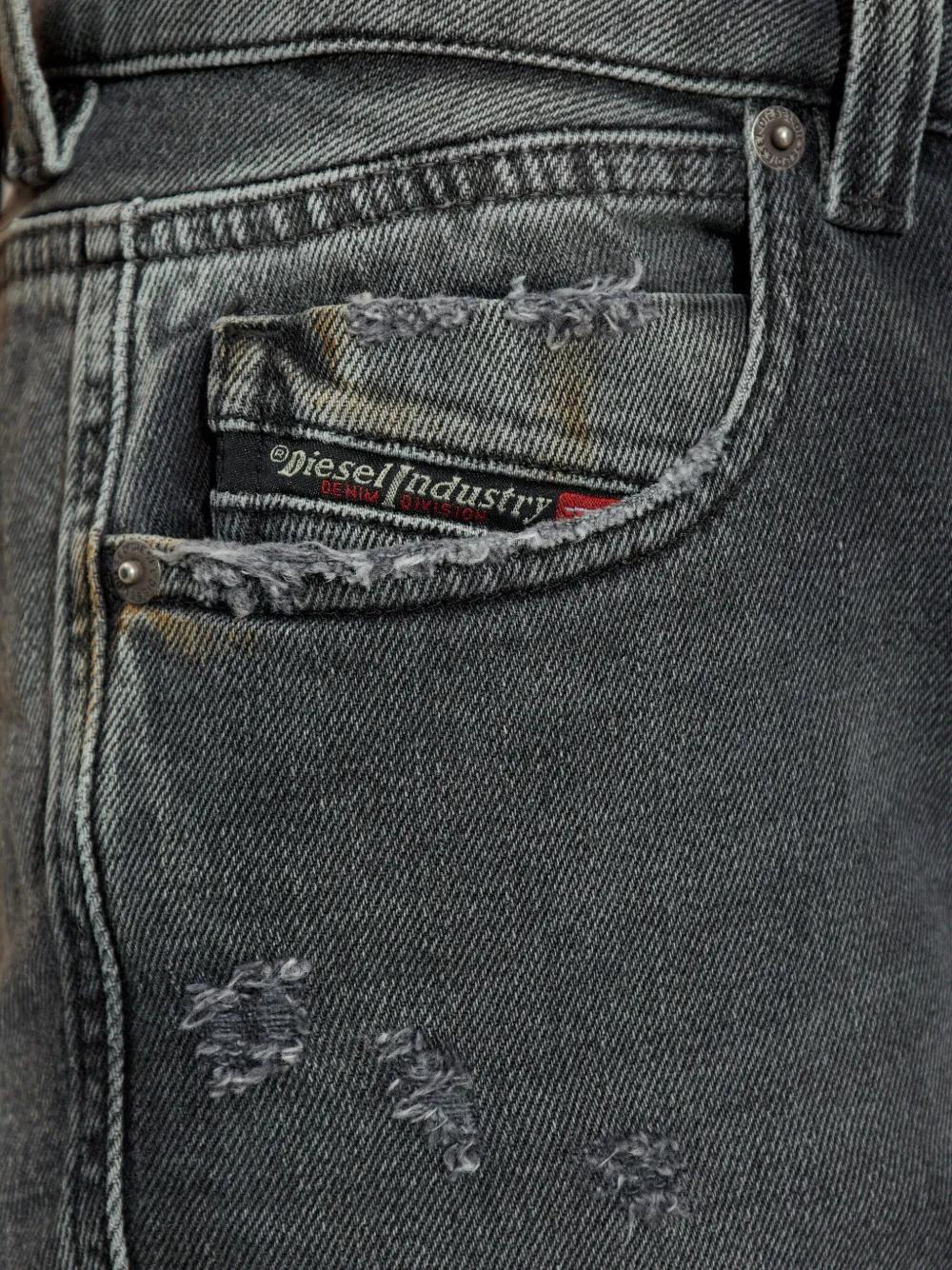 dark grey distressed detailing five pockets button fastening belt loops rear logo patch