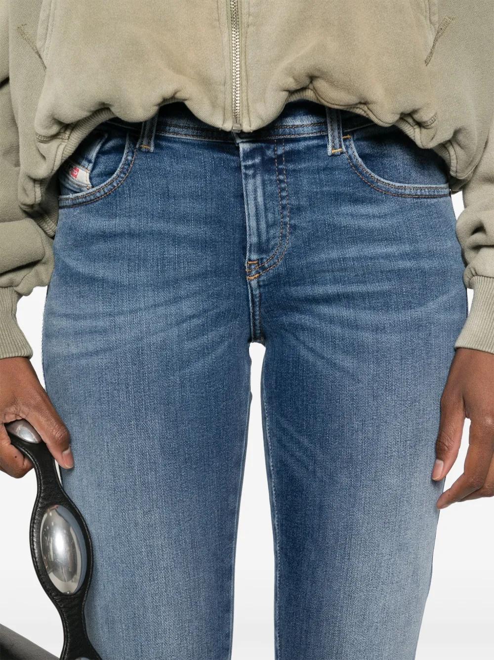 cerulean blue concealed fly and button fastening belt loops classic five pockets logo patch to the rear