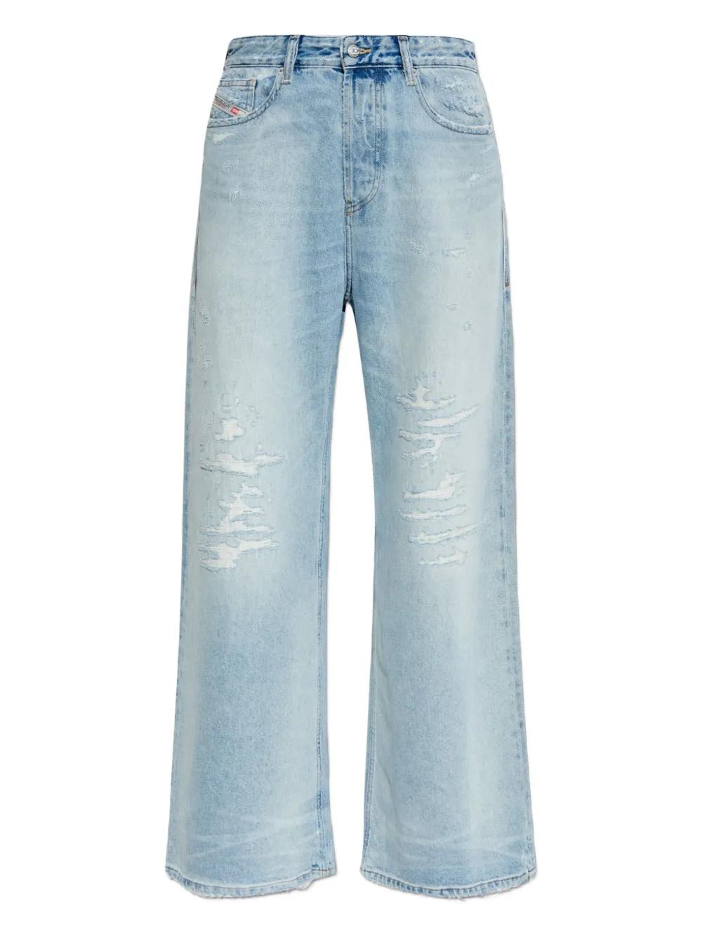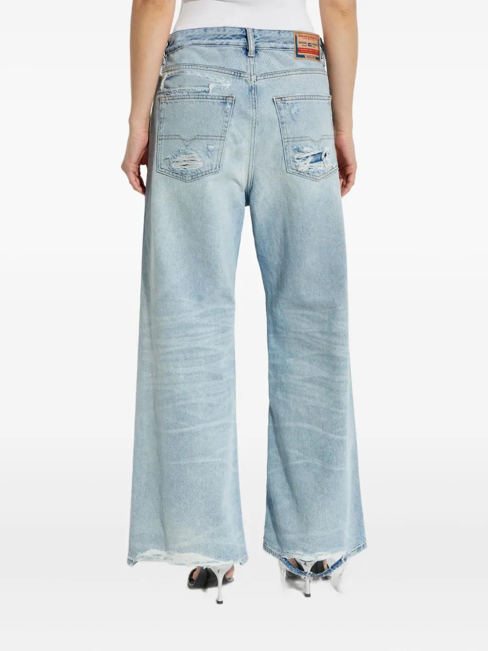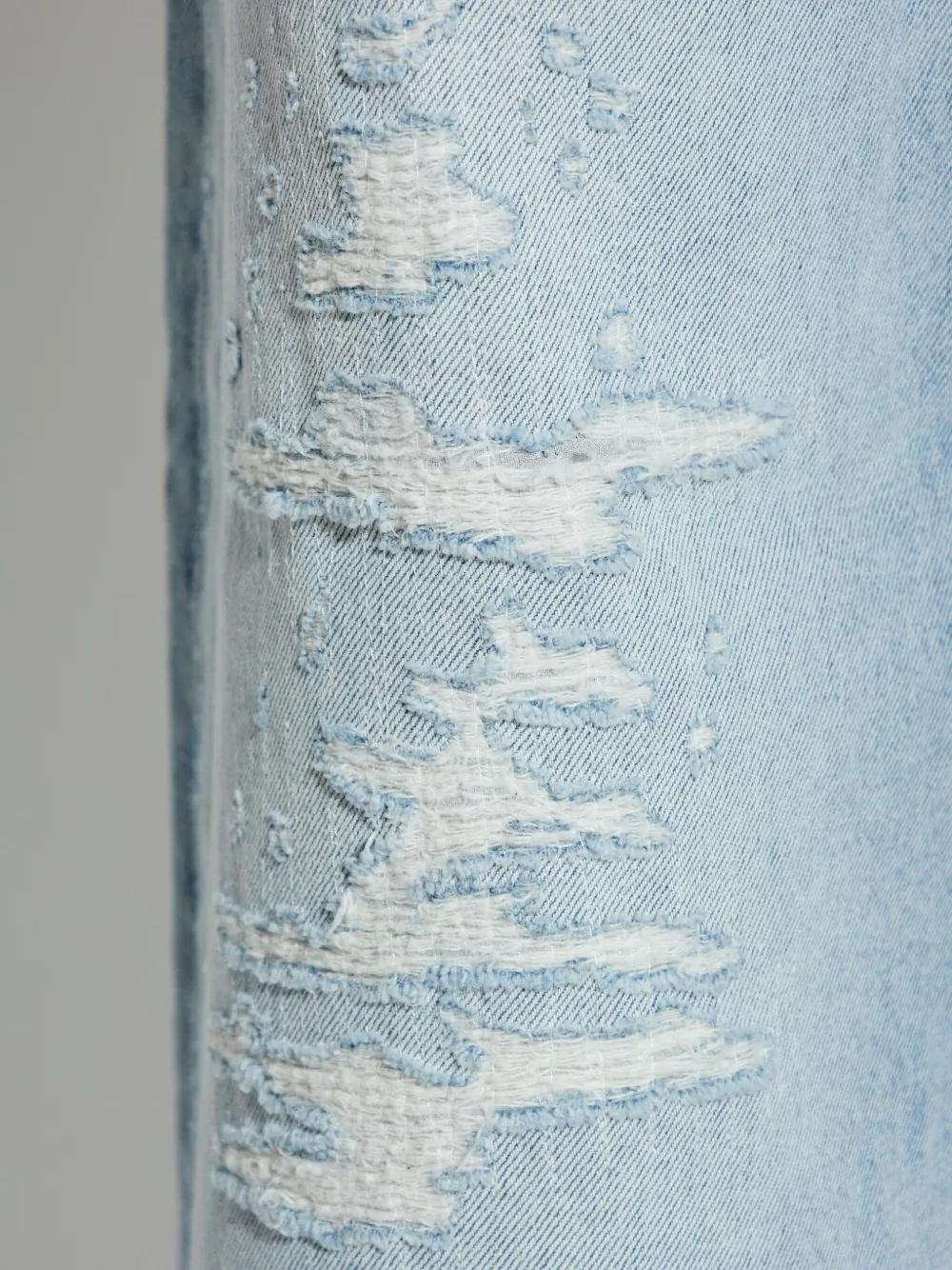 light blue front button fastening classic five pockets logo patch to the rear belt loops