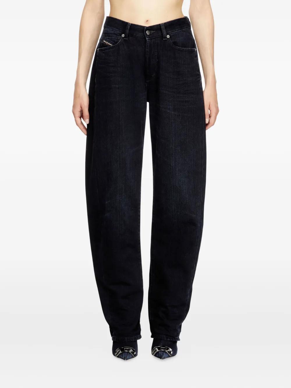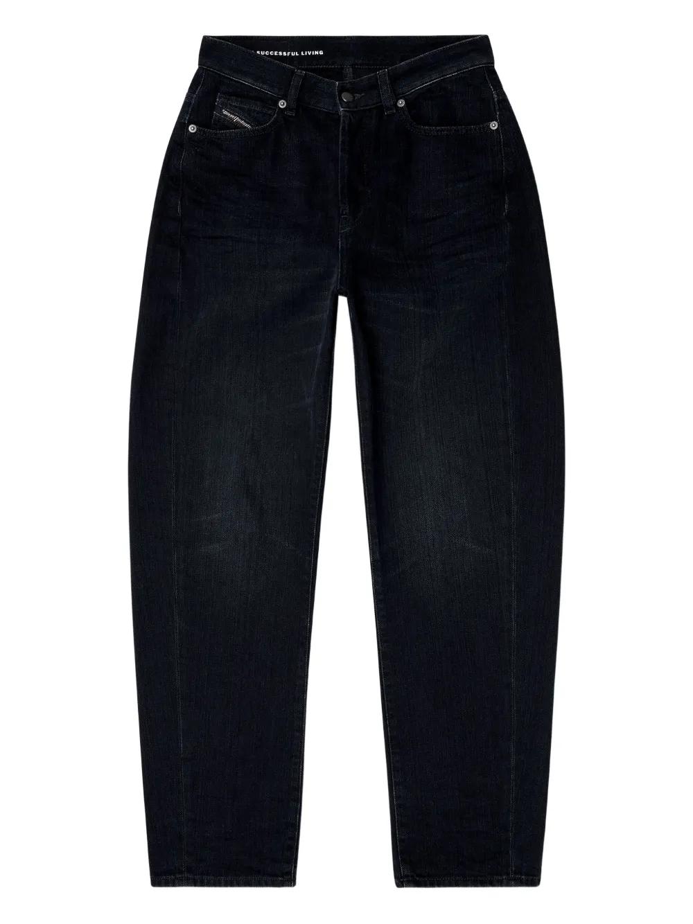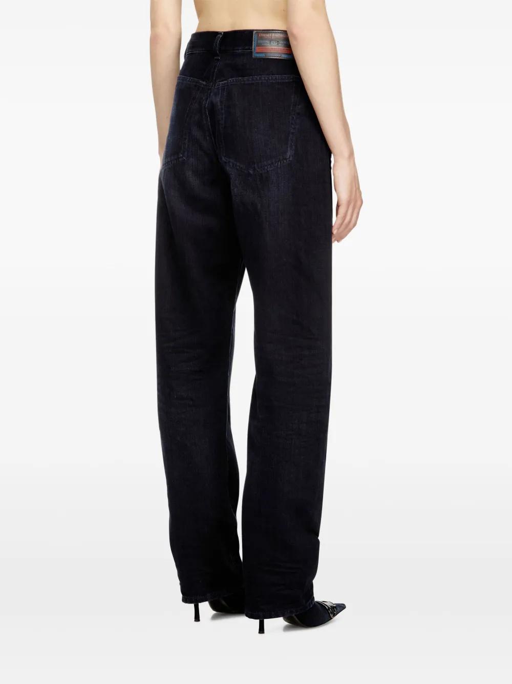 midnight blue belt loops classic five pockets rear logo patch top button closure