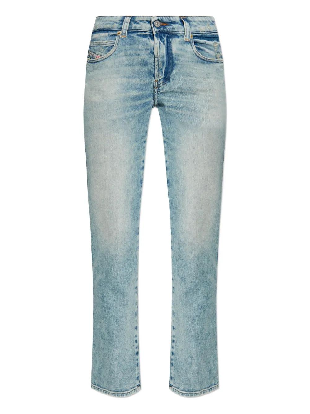 indigo blue cotton blend washed denim whiskering effect rhinestone embellishment appliqué logo belt loops classic five pockets concealed fly and button fastening cropped leg super-skinny cut