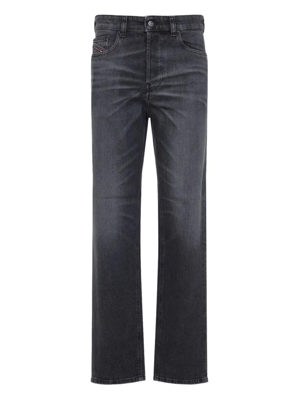 black denim five pockets belt loops rear logo patch button and zip fastening