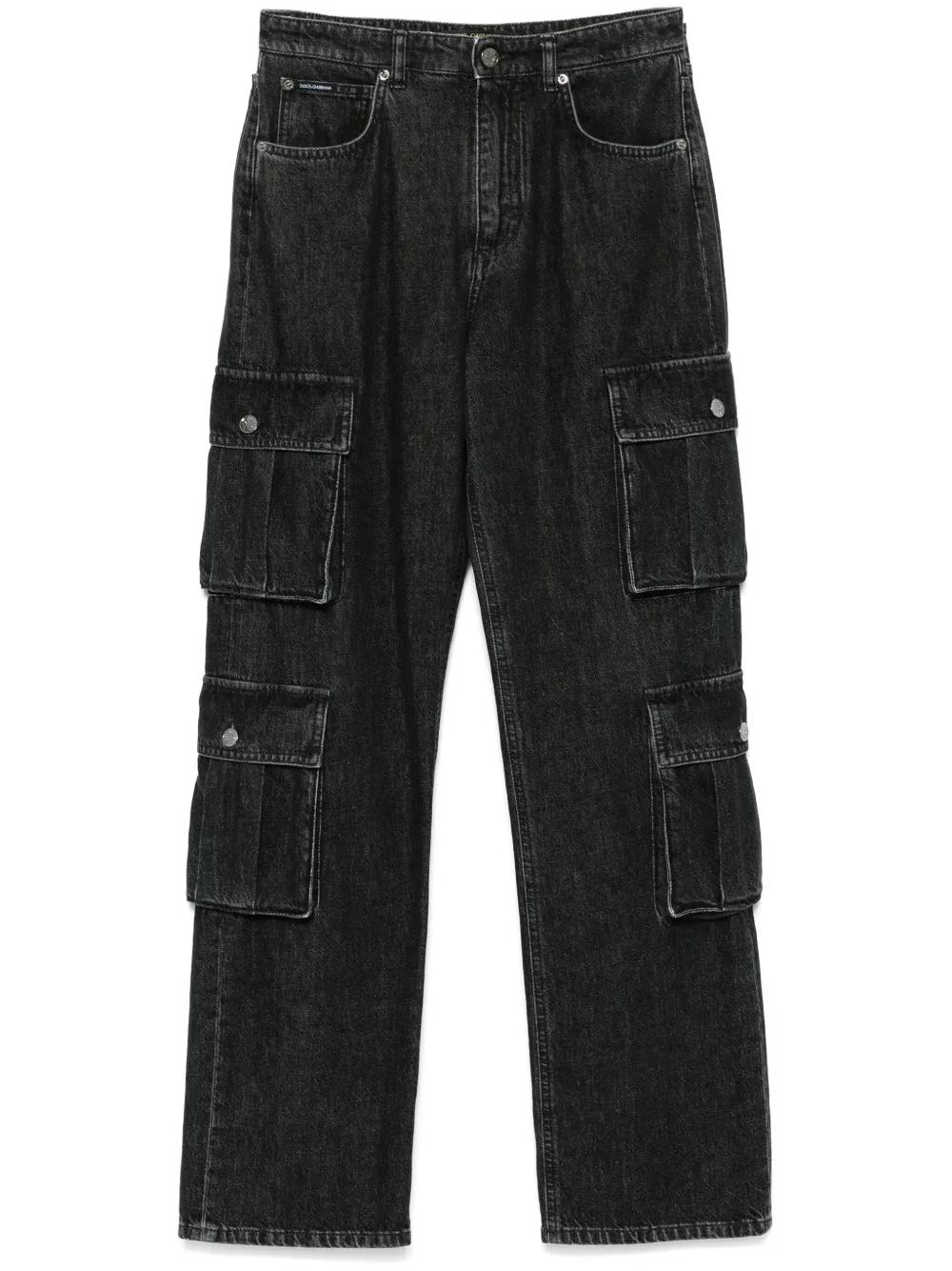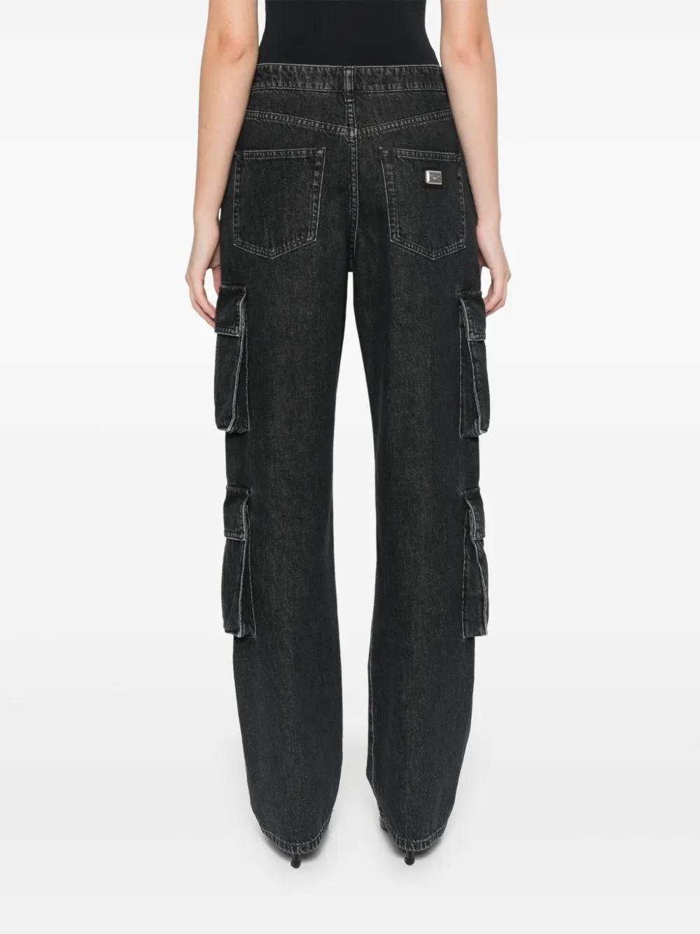 black cotton denim front button and zip fastening belt loops classic five pockets multiple cargo pockets logo plaque straight leg
