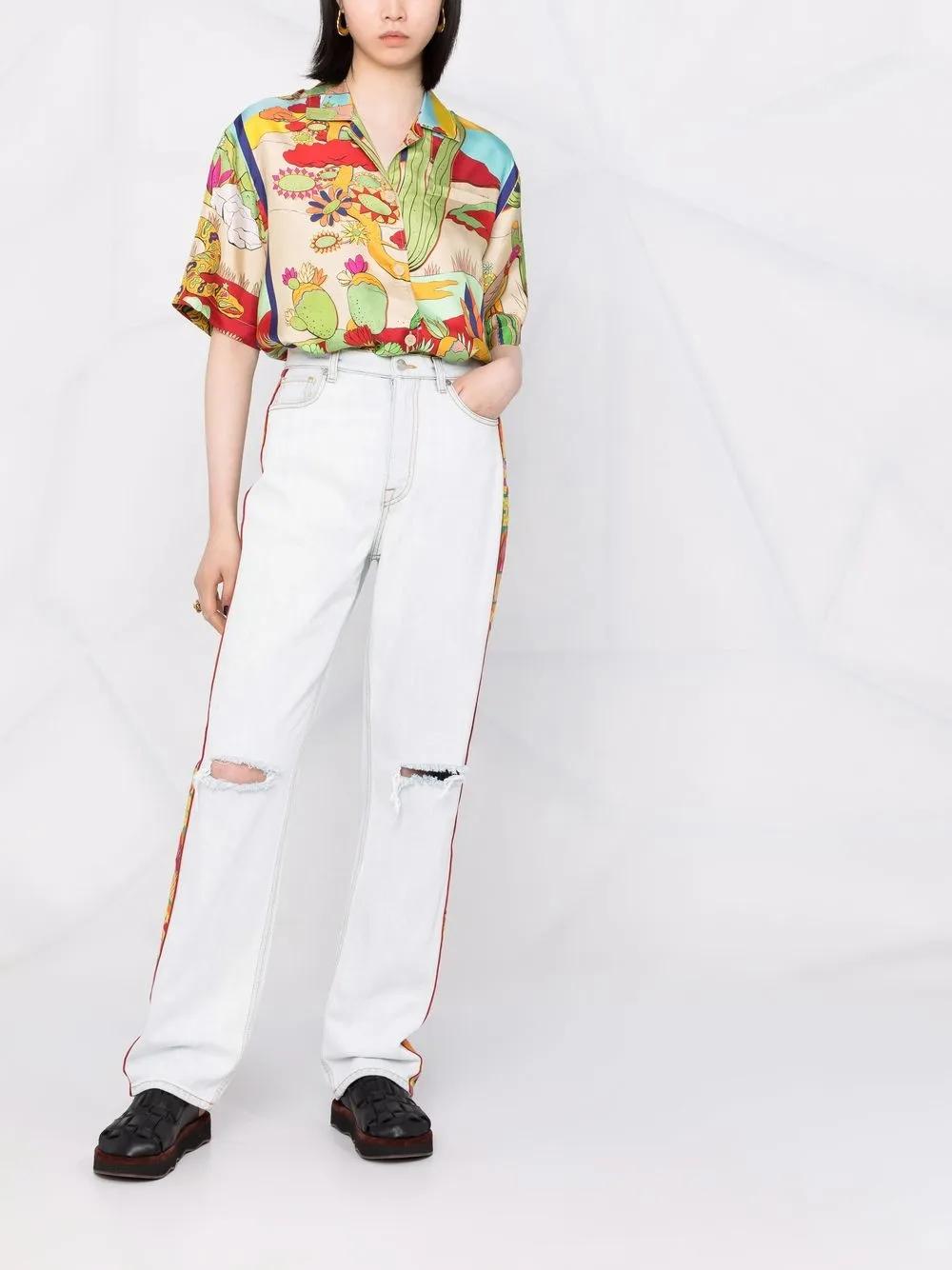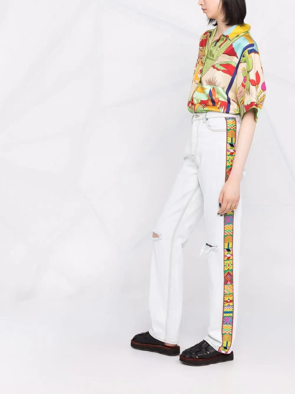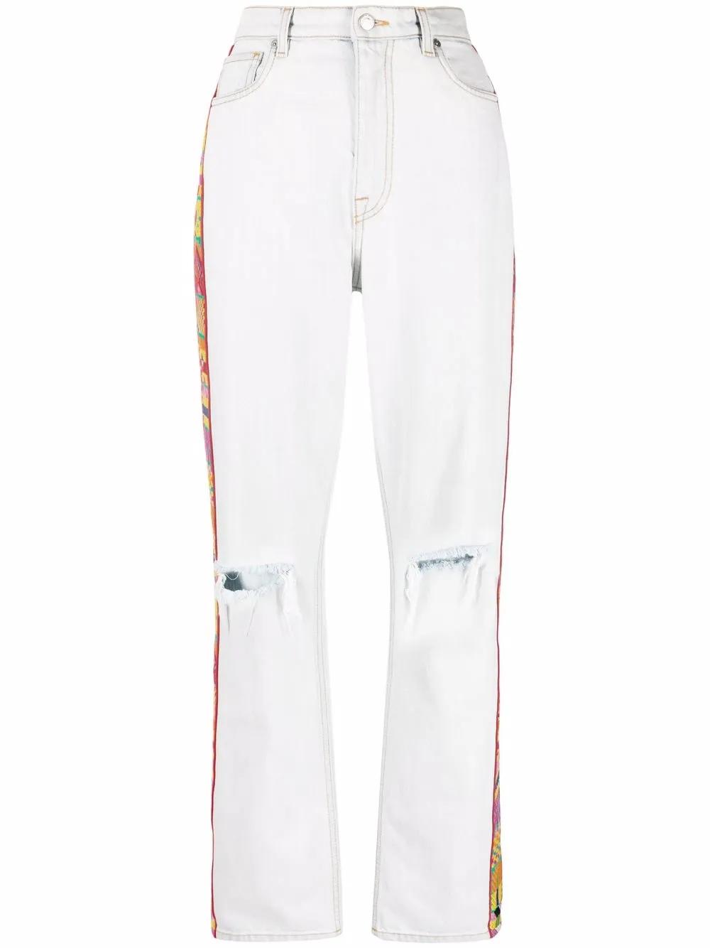 white/multicolour cotton blend embroidered edge geometric print ripped detailing straight leg classic five pockets front button fastening