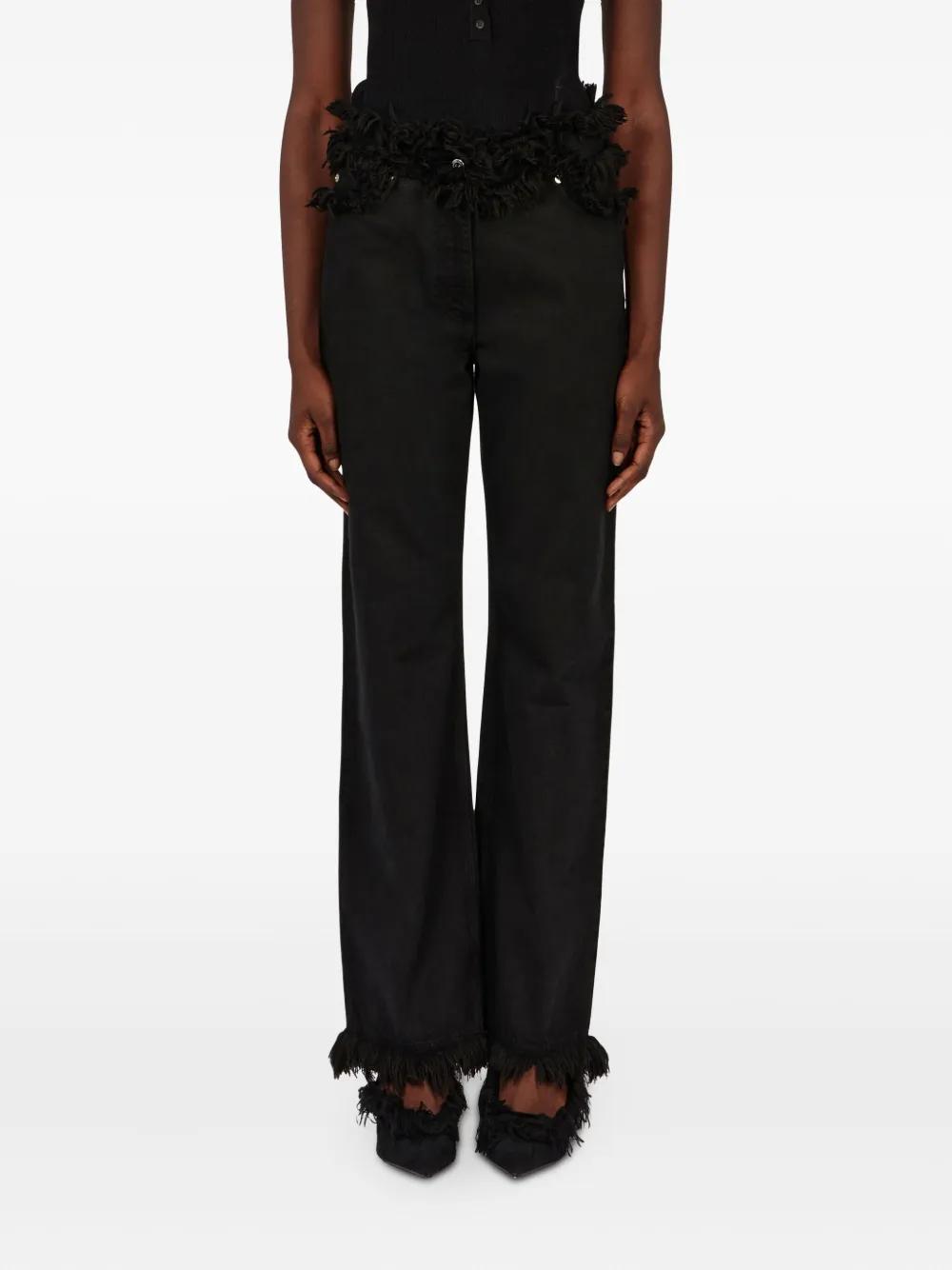 black front button and zip fastening fringe detailing two side slit pockets two rear patch pockets